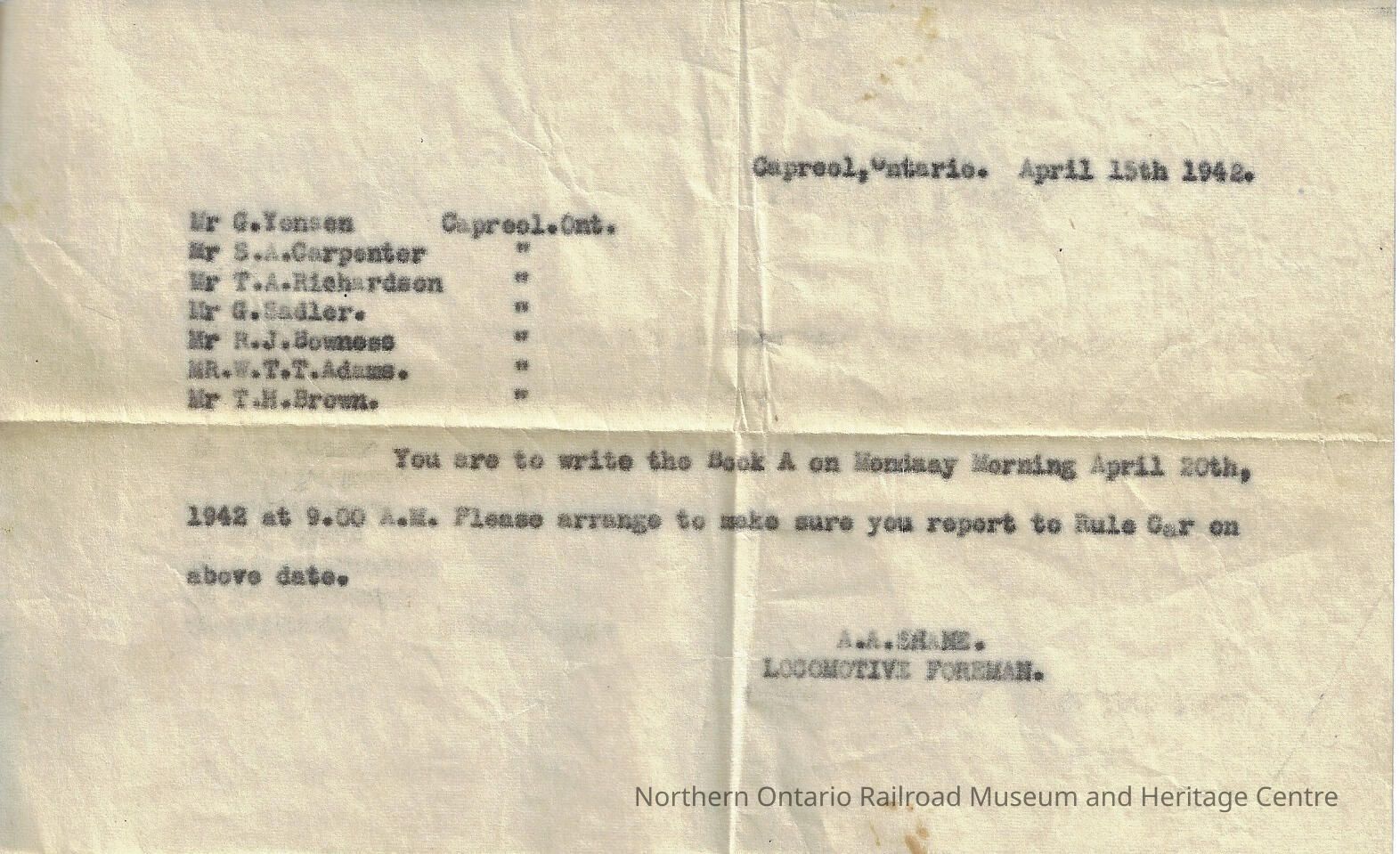 Letter from A. A. Shane, Locomotive Foreman Addressed to Mr. G. Yensen, Mr. S. A. Carpenter, Mr. T. A. Richardson, Mr. R. J. Bowness, Mr. W. T. T. Addams, Mr. T. H. Brown in Capreol, ON, April 15th, 1942Entry/Object ID