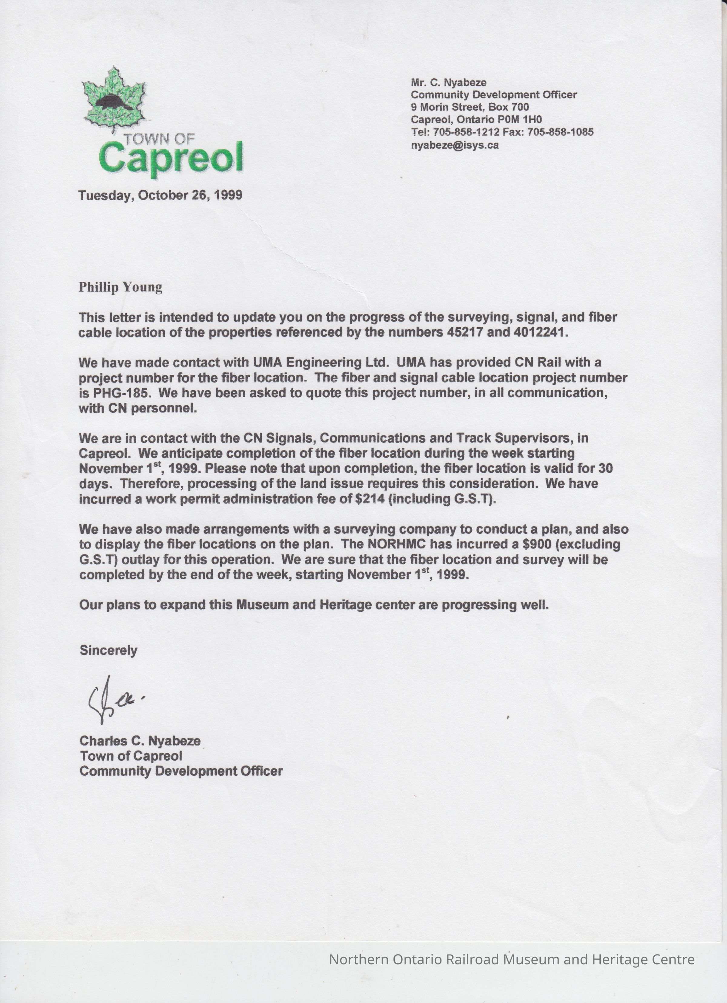 Letter from Capreol Community Development Officier Charles C. Nyabeze to CN Real Estate Phillip Young, RE: Update on progress of Surveying, Signal and Fiber LocationsDescription