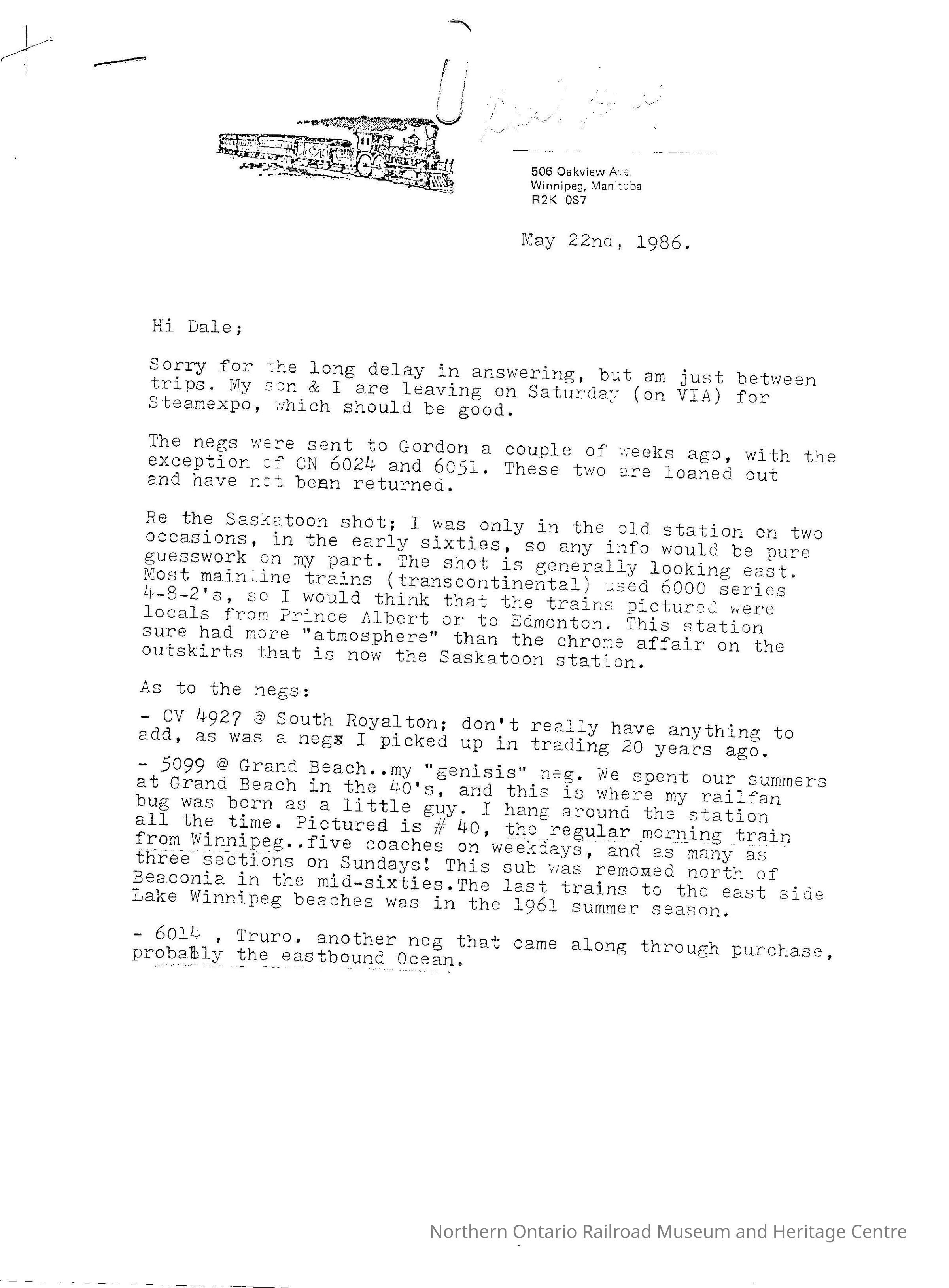 A letter pertaining to 14 historic photographs also donated by the author of the letter. The photographs are of various CNR locomotives in Western Canada.