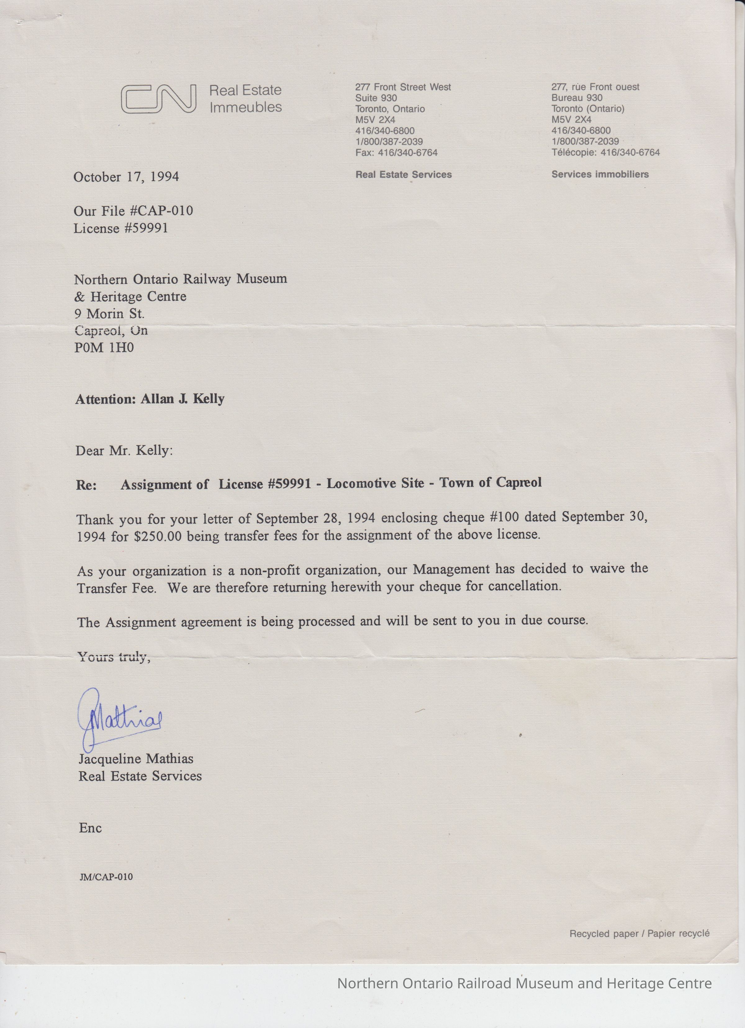 Letter from CN Real Estate Jacueline Mathias to NORMHC Allan J Kelly, RE: Assignment of License #59991 - Locomotive Site - Town of Capreol. Regards receipt of cheque #100 to pay for transfer fees.Collection