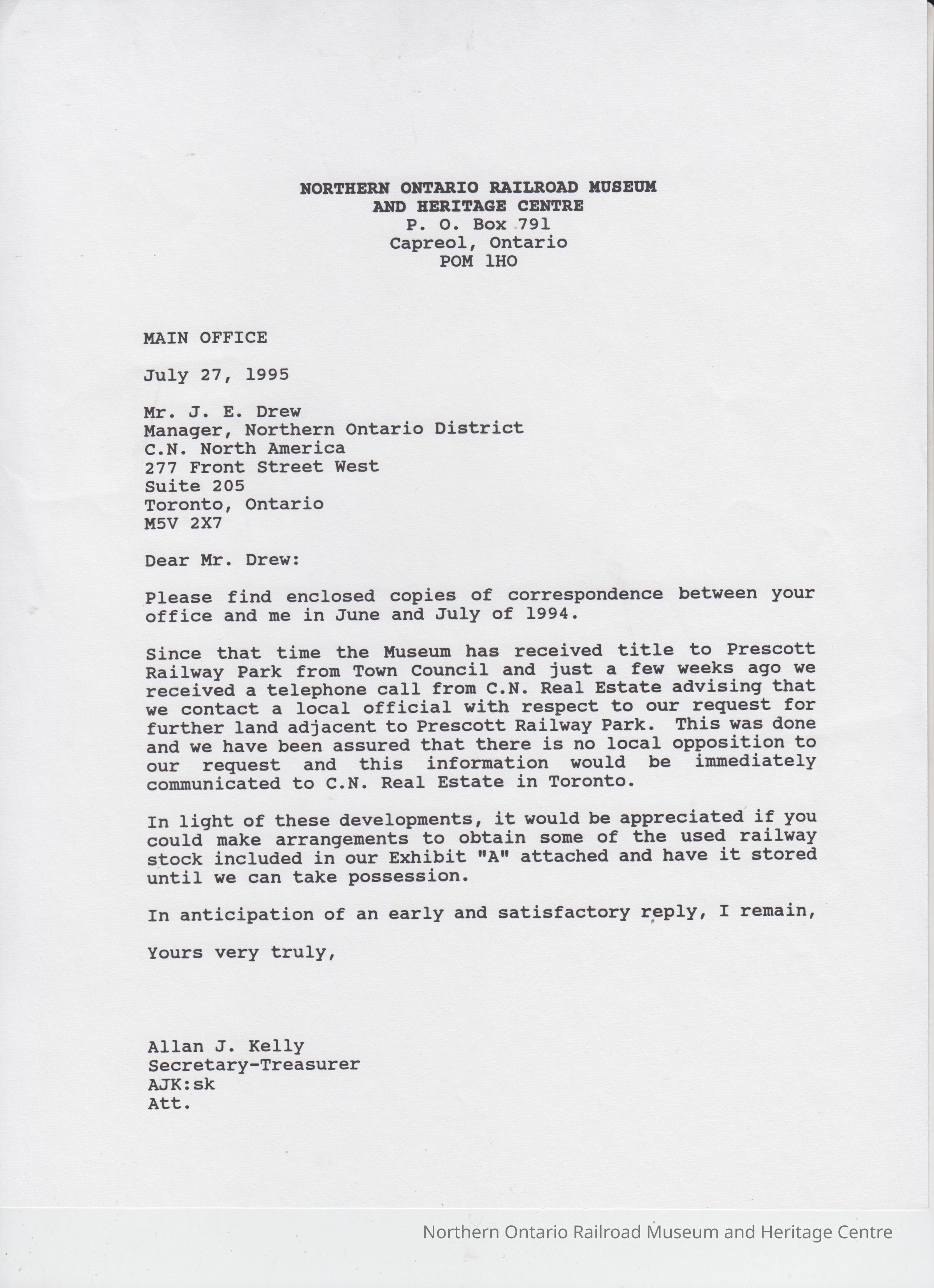 Letter from NORMHC Allan J. Kelly to CN Manager JE Drew, RE: Acquiring retired railway stock. Outlines correspondence from June and July of 1994, as well as request fro CN to start acquiring perspective museum exhibitsCollection