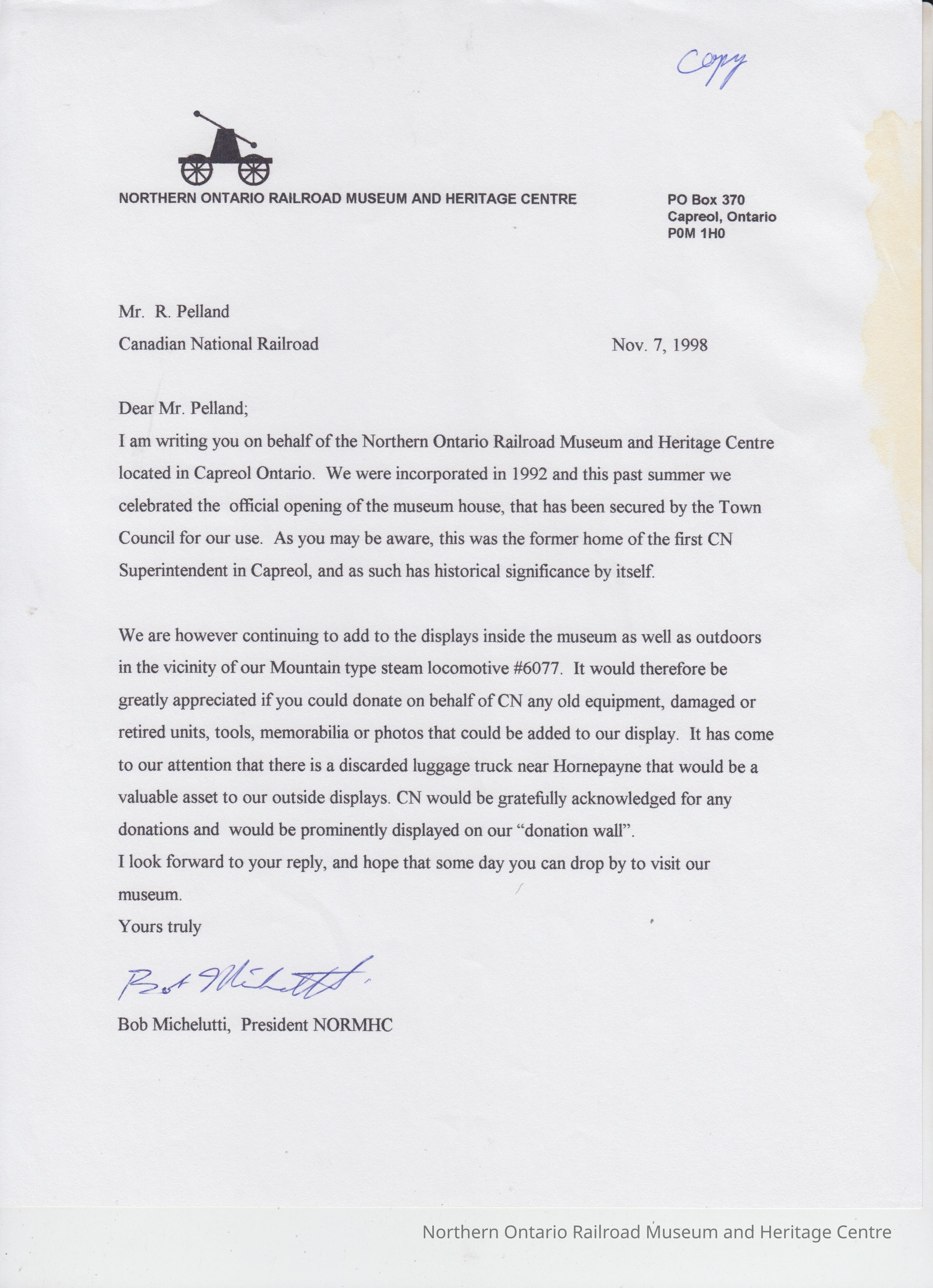 Letter from NORMHC Bob Michelutti to CN R Pelland, RE: Request for Old Cn Equipment. CN to donate and receive recognition on donation wallCollection