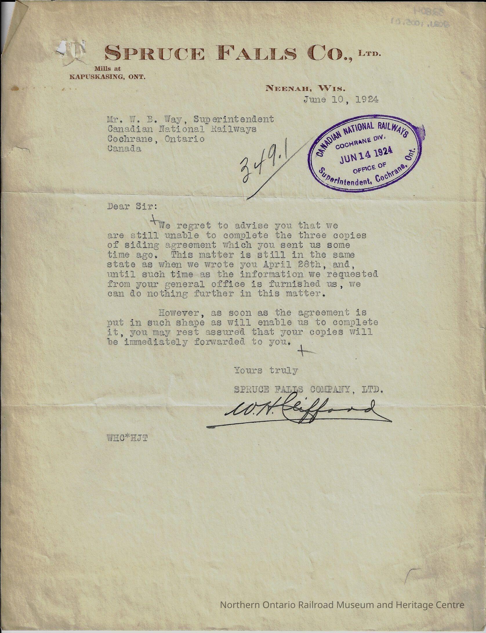 Letter sent to Mr. W. B. Way, the Superintendent for Canadian National in the Cochrane Division. The letter was sent from the Spruce Falls Company in Kapuskasing Ontario in 1924. It details how the Spruce Falls Company is unable to complete the three copies of a siding agreement that was sent them. The company explains how they require more information to be sent from the general office and how the agreements will not be complete until that information is sent to them.