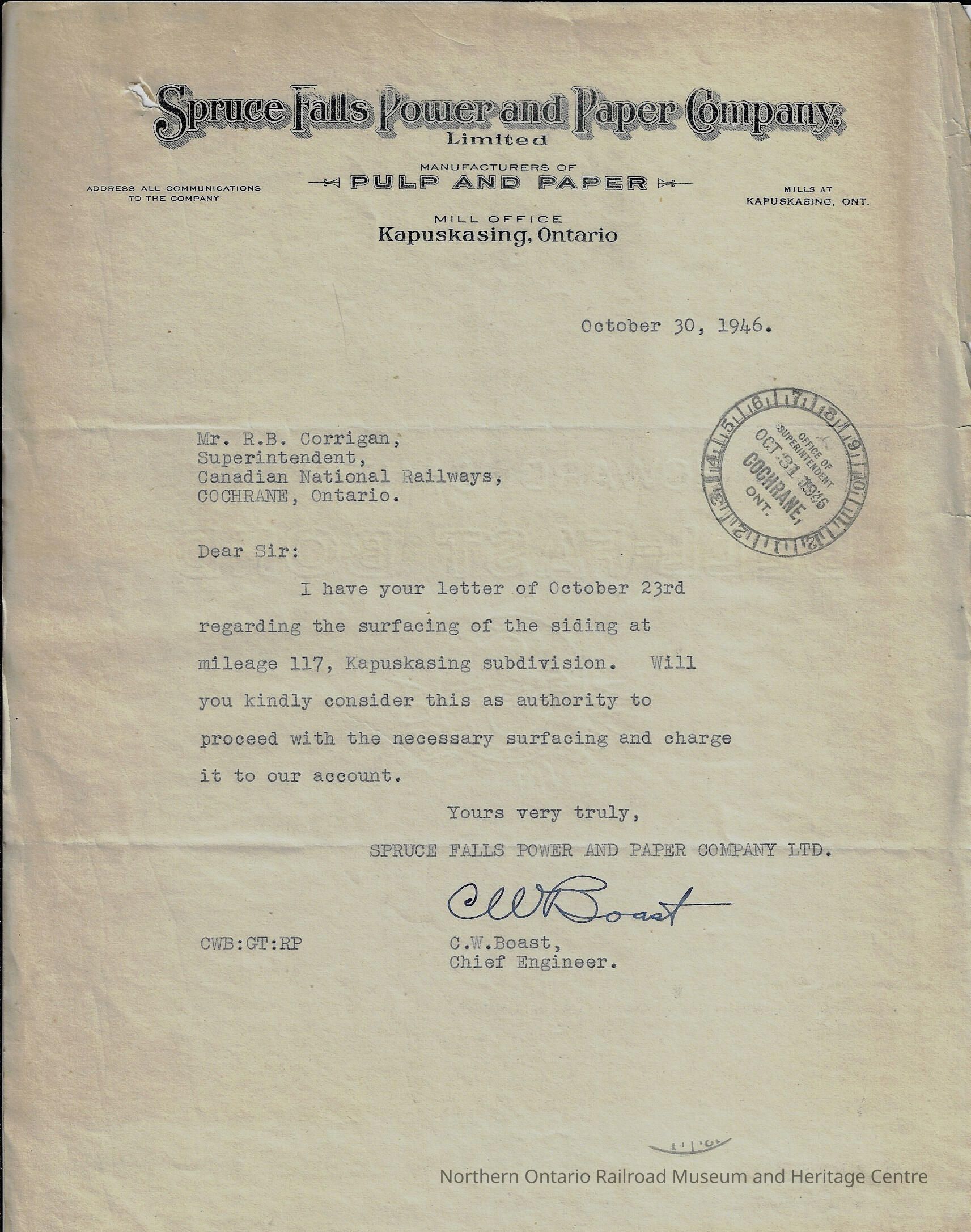 Letter written to R. B Corrigan, the Superintendent for the Canadian National Cochrane Division in 1946. It was sent from C. W. Boast, the chief engineer for the Spruce Falls Power and Paper Company. The letter discusses the plan to surface siding at mile 117 in the Kapuskaing subdivision. Boast is inquiring that he may begin the project and bill Canadian National accordingly.