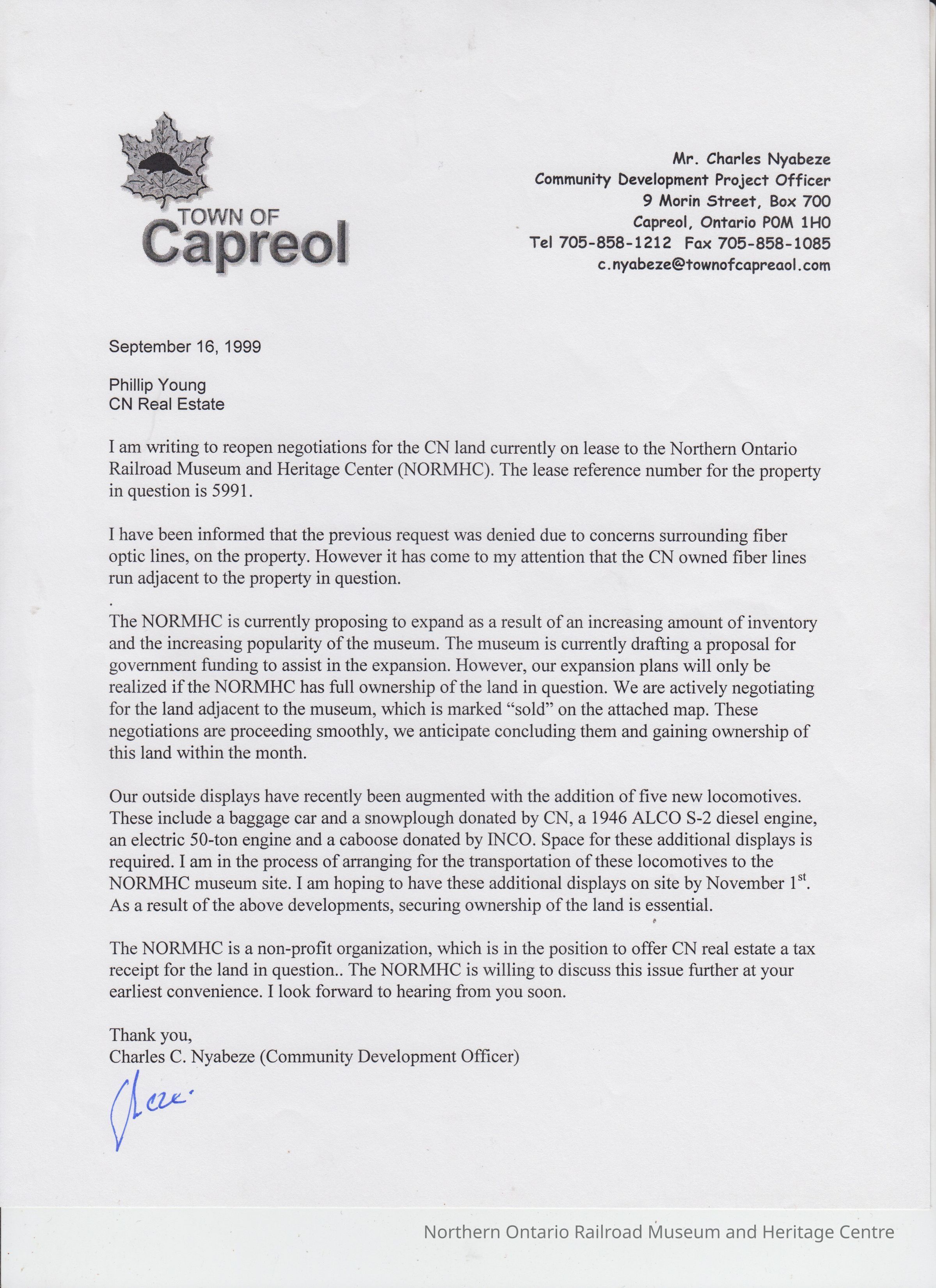 Letter from Town of Capreol Charles Nyabeze to CN Real Estate Phillip Young, RE: Reopen negoitions for CN land of NORMHC for ExpansionDescription