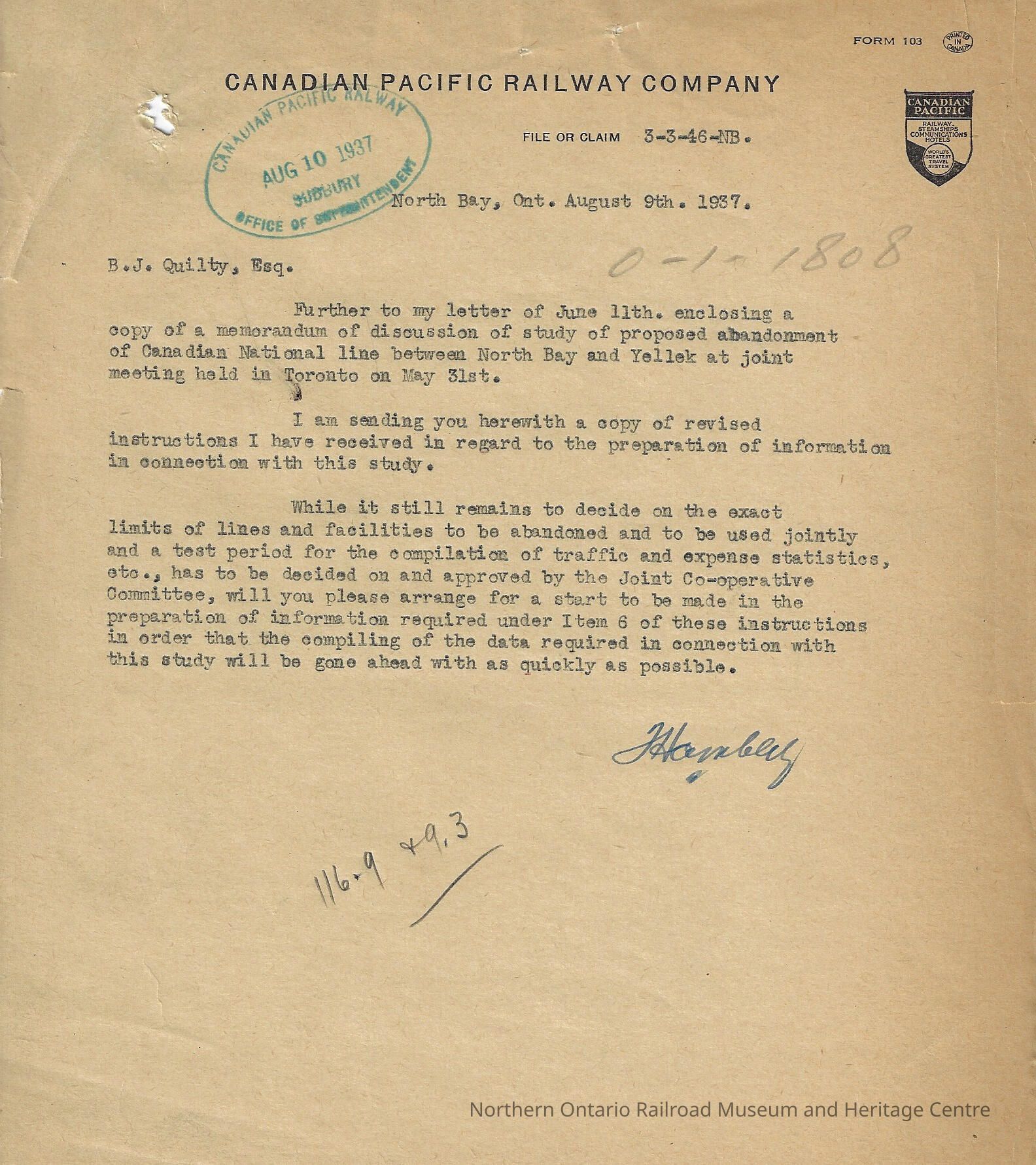 Letter sent from T. Hambley, esquire to B. J. Quilty regarding the proposed abandonment of Canadian National's line between North Bay and Yellek. Written on August 9, 1937.Creator
