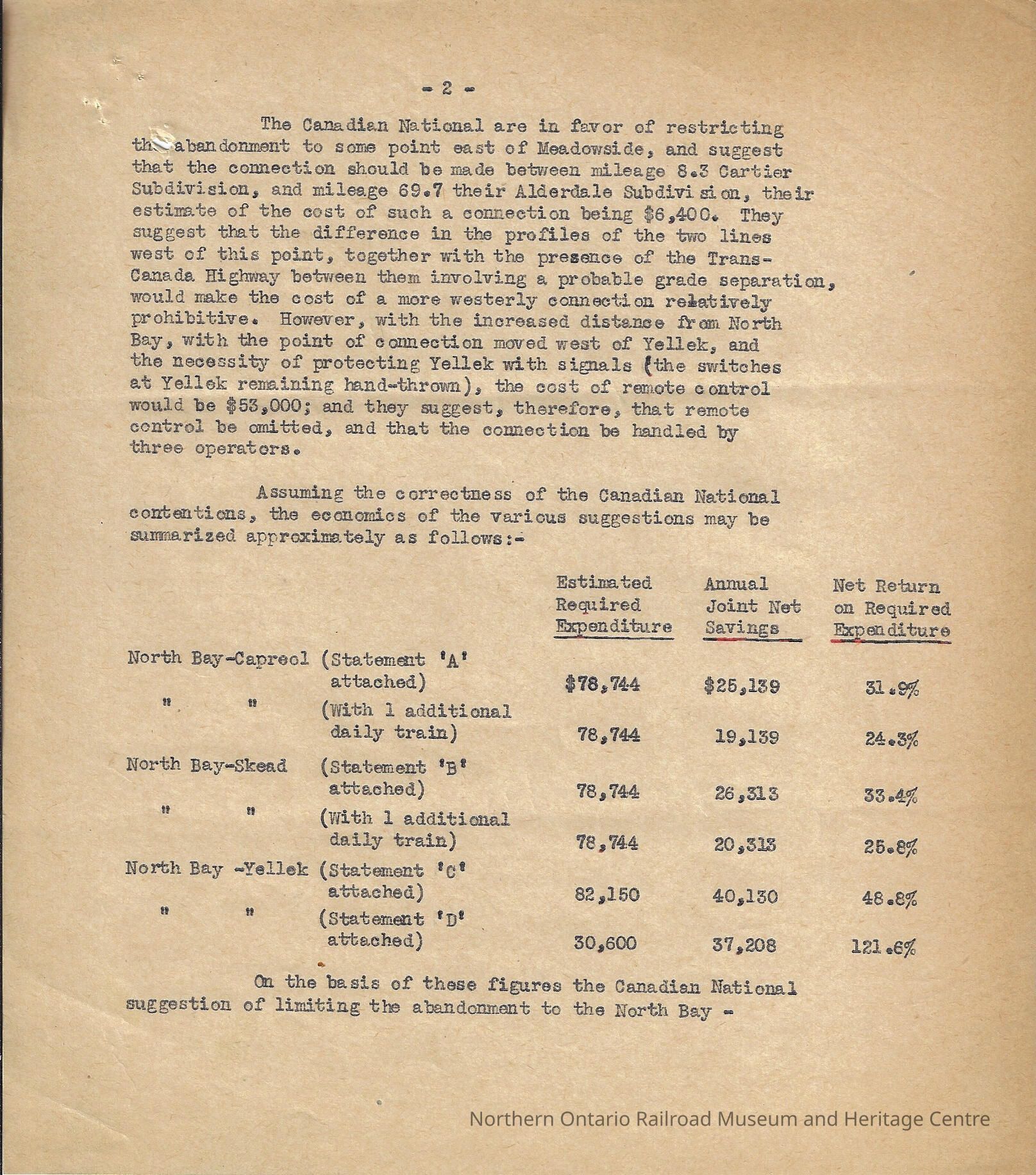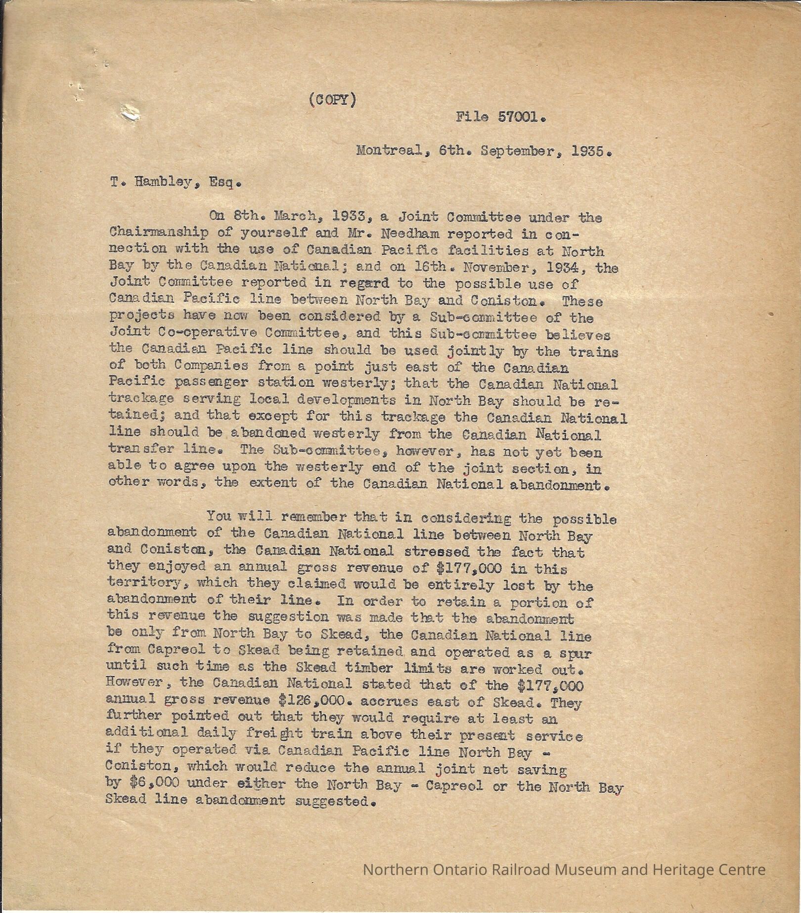The letter is a copy of the original, and it discusses a Joint Committee report on the use of Canadian Pacific facilities at North Bay by Canadian National, for the possible use of the Canadian Pacific Line between North Bay and Coniston.