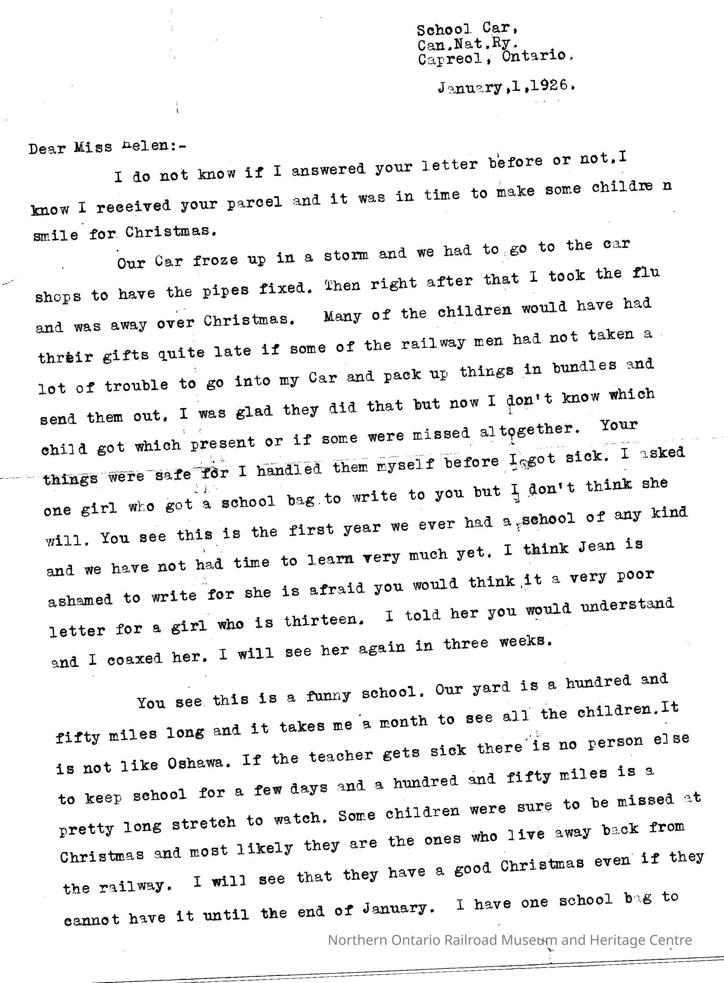 A letter addressed to "Miss Helen" from Fred Sloman. It was written on January 1st, 1926 and is thanking Helen for sending gifts for the school children on the school car. He also describes how the pipes froze and he had to take the car in to get it fixed, but some railmen bundled up the gifts and brought them to the expecting children. He compares school car teaching to teaching in Oshawa. He ends the letter by wishing her well for the new year.Context