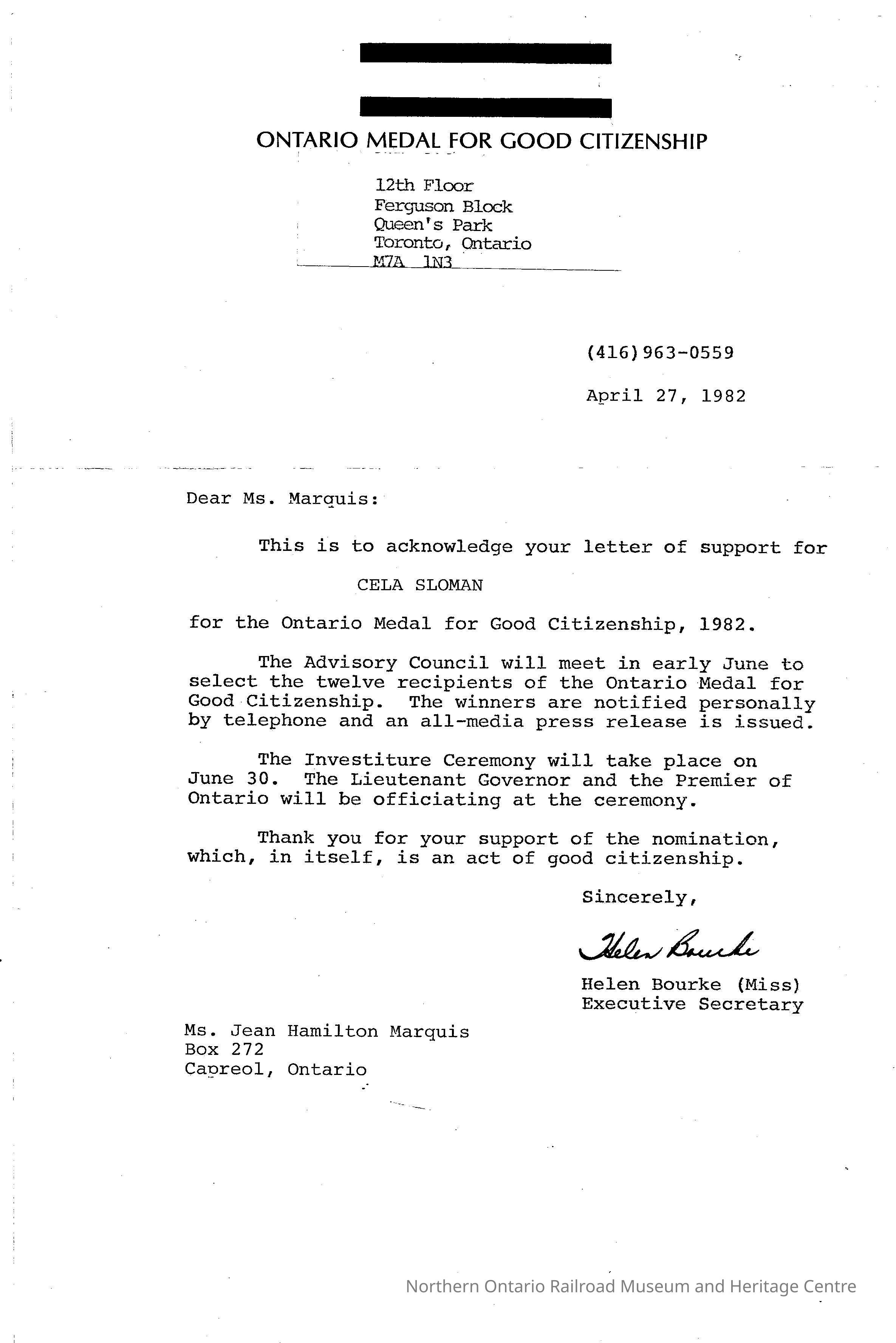 Letter addressed to Ms Marquis in Capreol ON from Helen Bourke in Toronto ON discussing the fact that Cela Sloman was nominated for the Ontario Good Citizenship award. She tells Ms. Marquis that the ceremony will take place on the 30th of June in 1982.Context