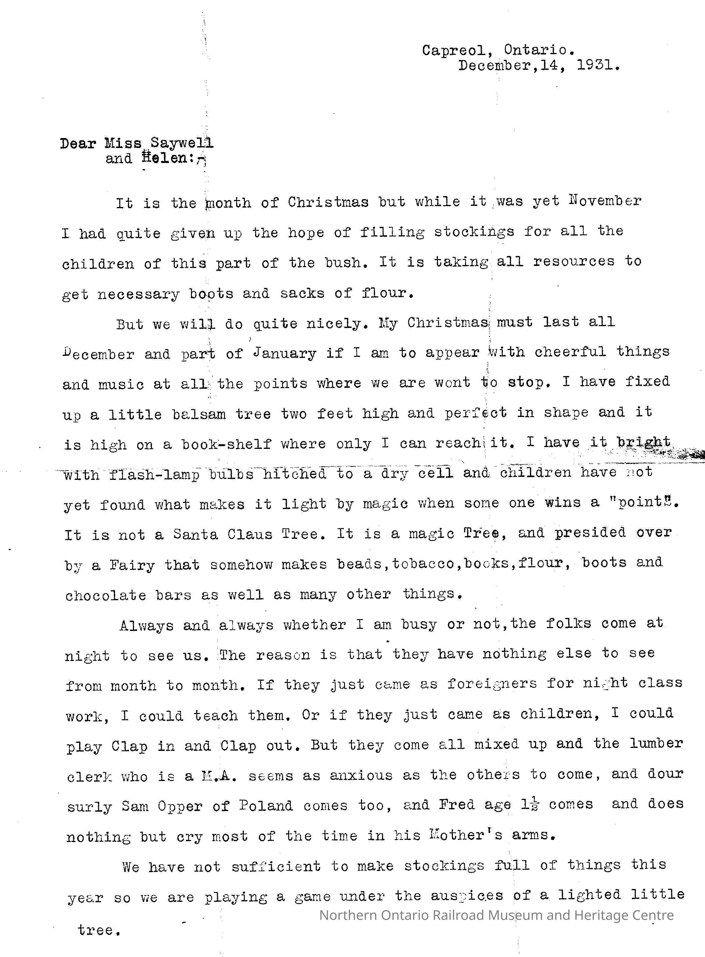 A typed letter addressed to Miss Saywell and Helen discussing Christmas plans for the year 1931 and how he plans to distribute the gifts and what he tells the children. Fred also explains how the gift exchanges happen through a series of games he develops to ensure no one goes home empty handed.Context