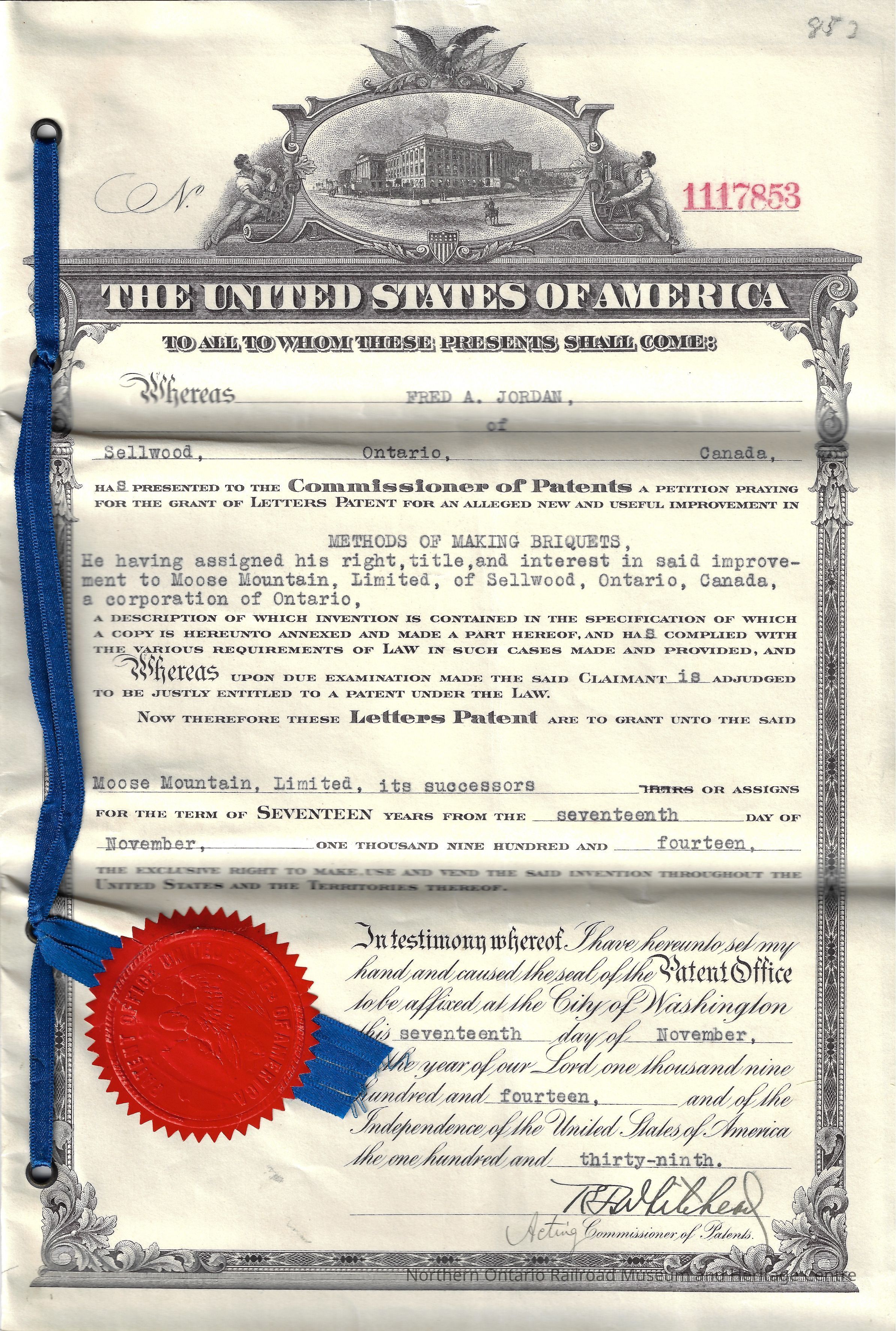 Letters of Patent for Fred A. Jordan's application for his "improvements in methods of making briquets" granting the rights to Moose Mountain Limited. No. 1117853. Signed by T. Whitehead, Acting Commisioner of Patents at the United States of America Patent Office, on November 17th, 1914. The documents include a description of the invention written by Fred A. Jordan, a total of three pages, and a single page with a technical diagram of the invention at the beginning. There are four pages in total, enclosed in a paper cover and tied together with a blue ribbon.There is an official United States Patent Office seal (red, with the image of an eagle with wings spread in the centre) on the bottom left corner of the front cover. There is a black and white image of the Patent Office centered at the top of the front cover, inside an ornate frame. At the top of the frame is an eagle with wings spread, to the left and right there is a seated man, turned to face the patent office. At the bottom of the frame is the United State of America flag, inside a shield. The rear cover is blank.Collection