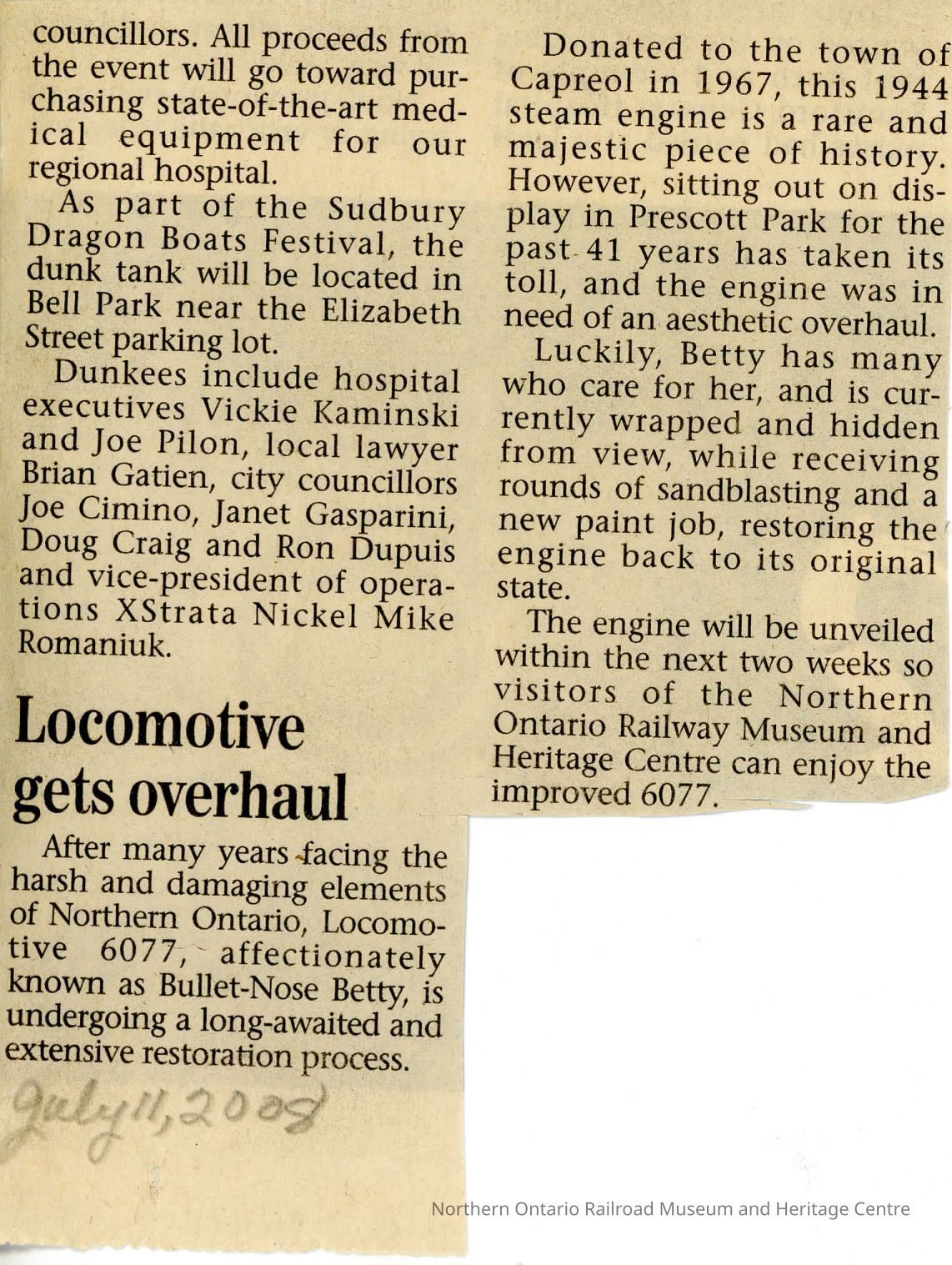 "Locomotive gets overhaul" Newspaper Article, outlining the restoration of #6077.Collection