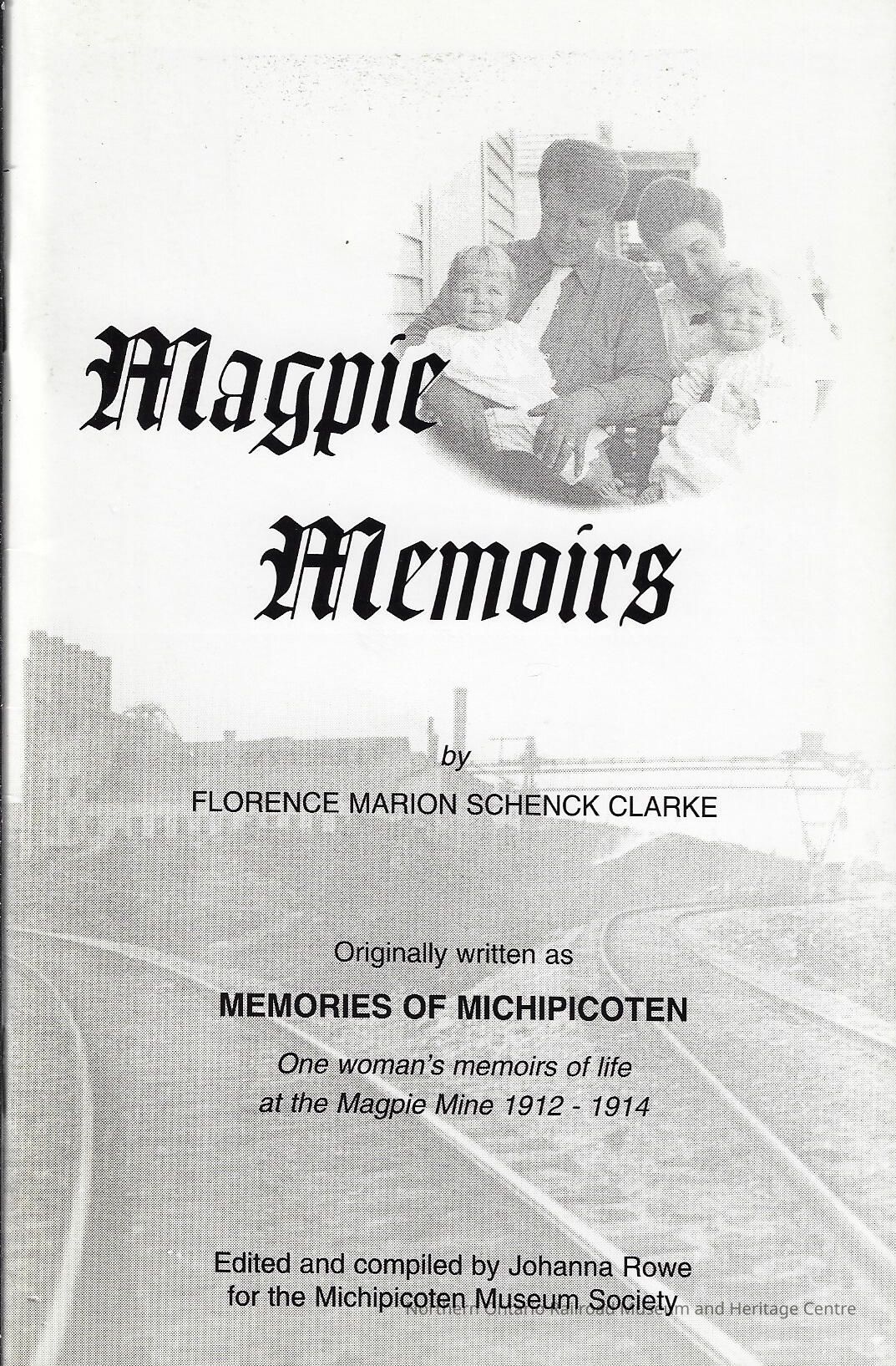 Book, collection of memoirs from Florence Marion Schenck Clarke, who lived in Wawa during the early days of the Magpie Mine.Context