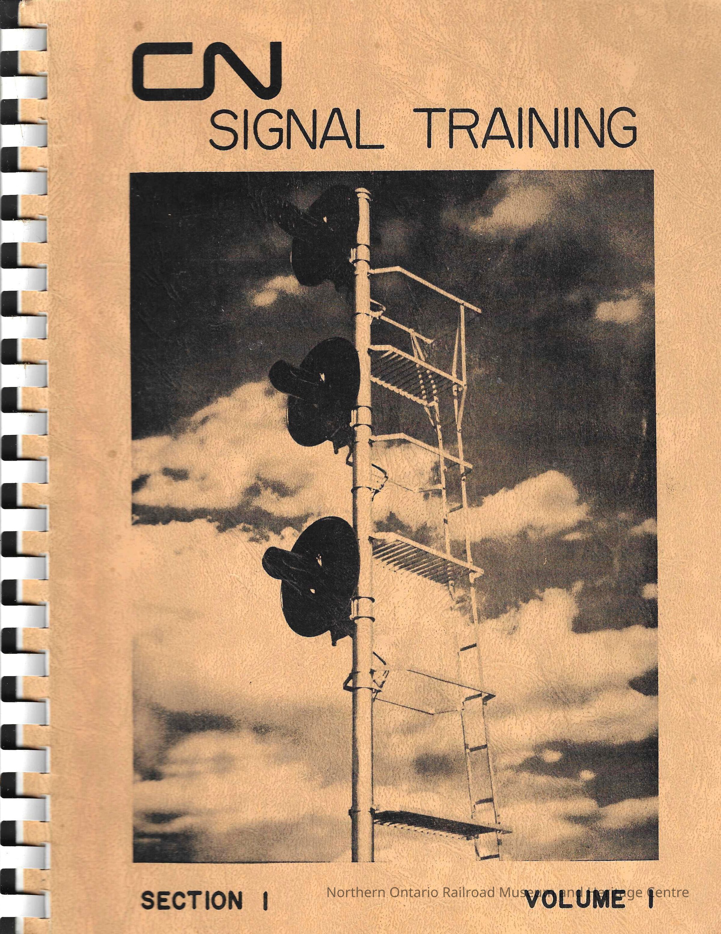 Book, manual for Canadian National's signal training for new employees. Includes: railway signaling, electronics, signaling, multimeter, energy distribution, batteries, direct current relays, track appliances, understanding circuits, track circuit, troubleshooting, answers to questions, definitions