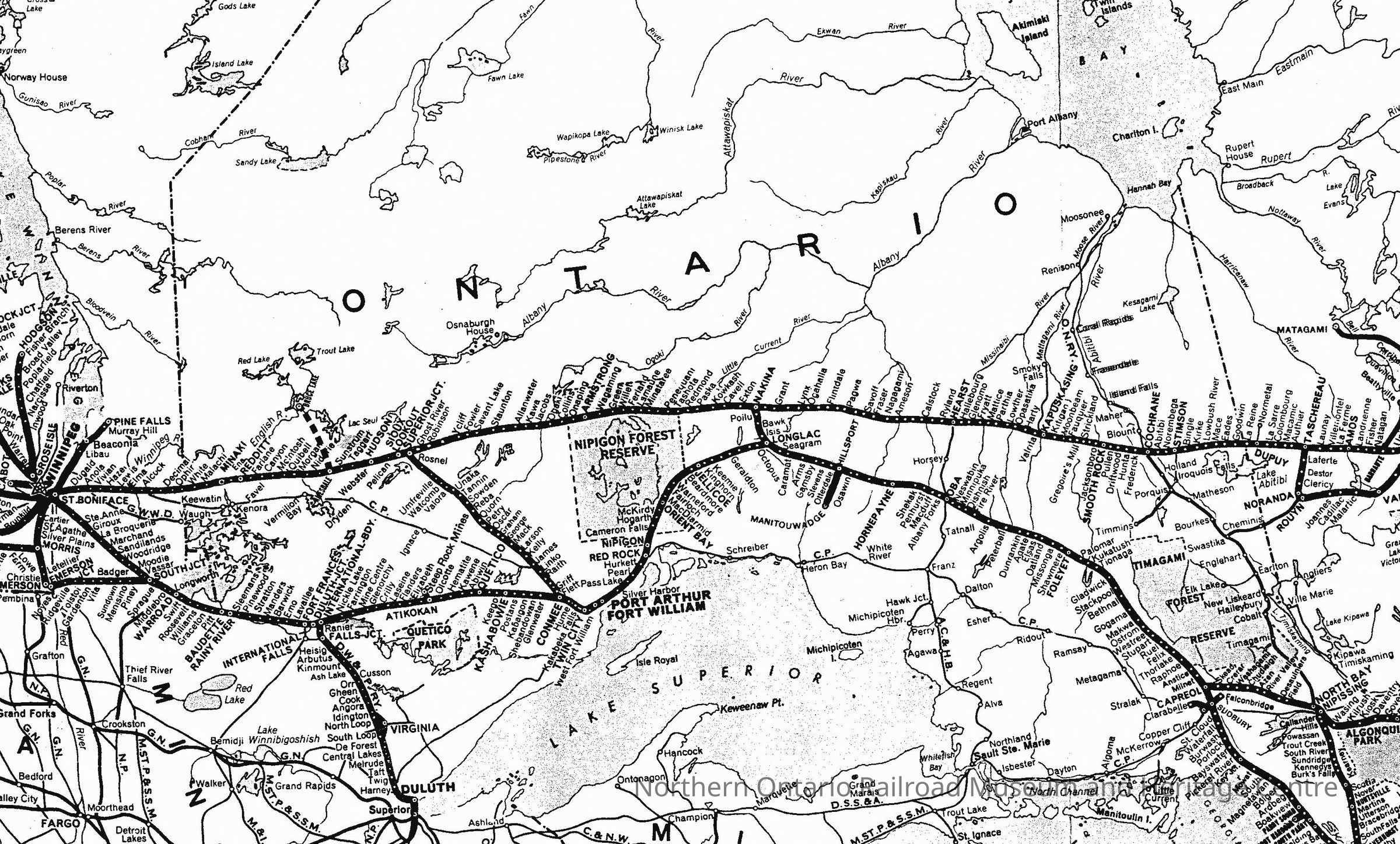 Map of Canadian National lines through Northern Ontario.