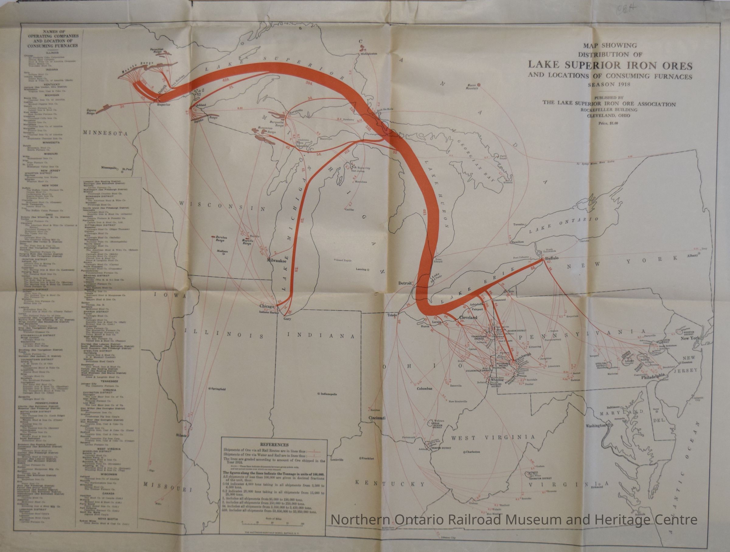 A map detailing the distribution of Lake Superior Iron Ores, and locations of consuming furnaces, in the season of 1918. Covers the States of Minnesota, Wisconsin, Minnesota, Ohio, Missouri, Pennsylvania, New York, Illinois, Indiana, Kentucky, West Virginia, and Virginia. The routes are marked in orange. Includes a list of operating companies and the locations of consuming furnaces.Collection