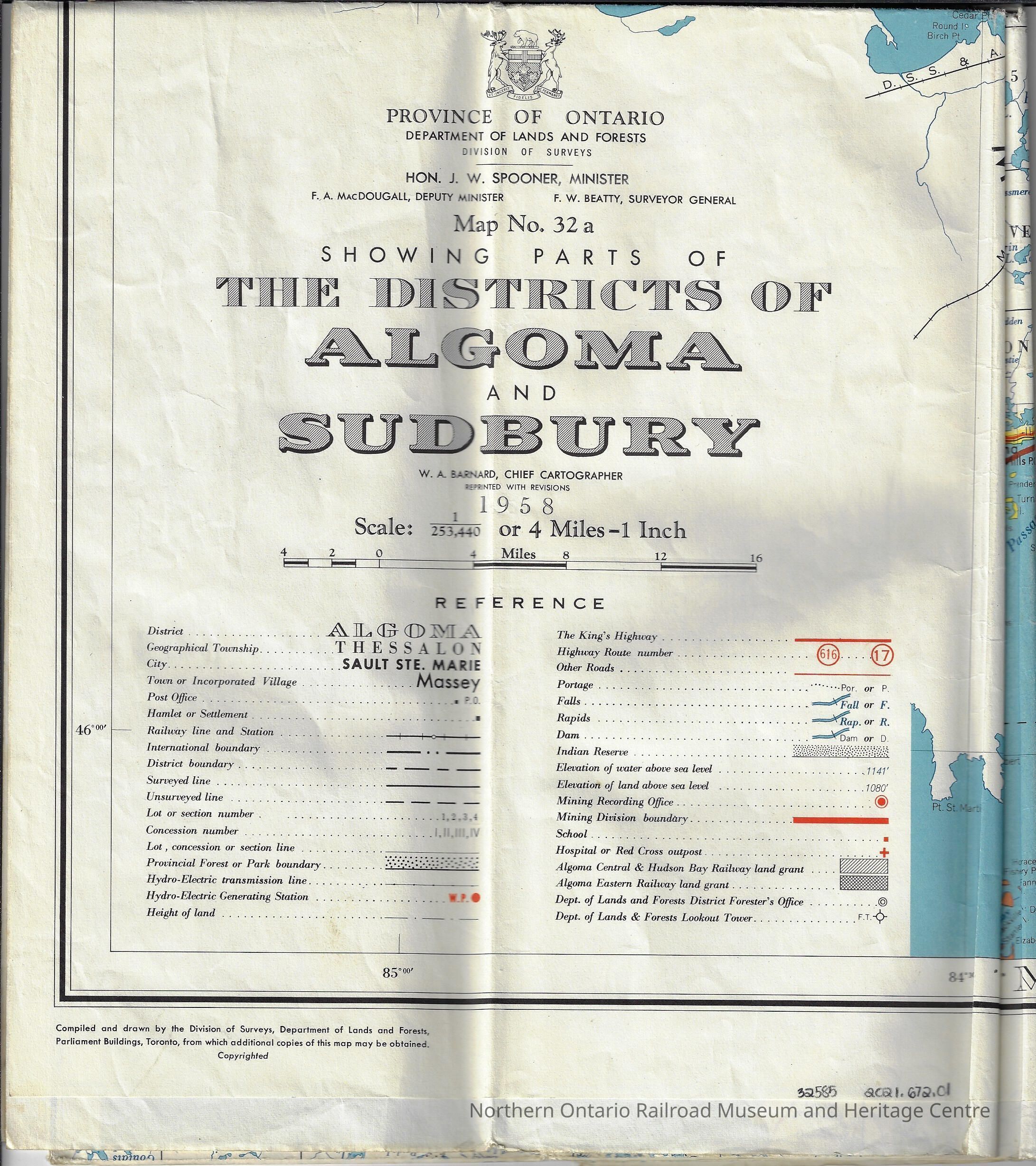 Map of the Districts of Sudbury and Algoma published by the Province of Ontario's Department of Lands and Forests. Shows the Algoma Eastern and Algoma Central railways along with water elevations, Indigenous reserves, schools, hospitals, cities, boundaries, highways, portages, falls, rapids, dams, railway lines and stations, parks, among other areas.