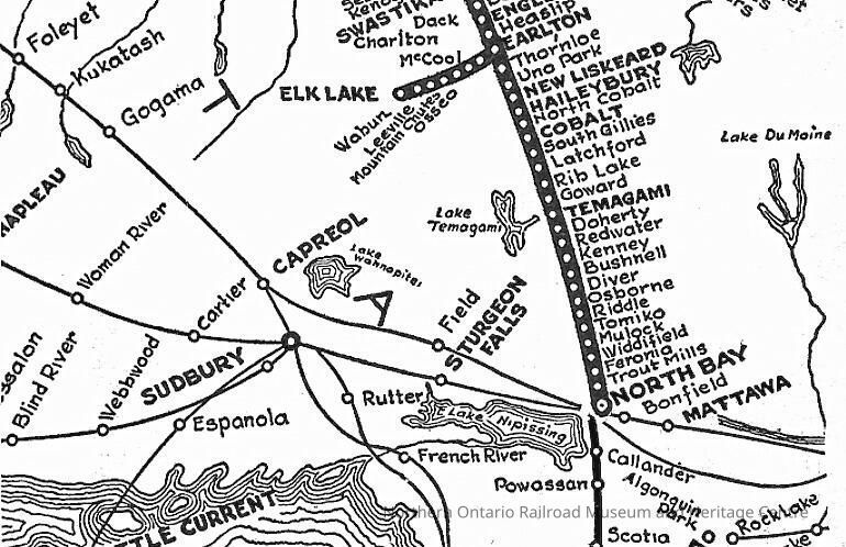Digital reproduction of a map of the Temiskaming and Northern Ontario Railways' school car route.