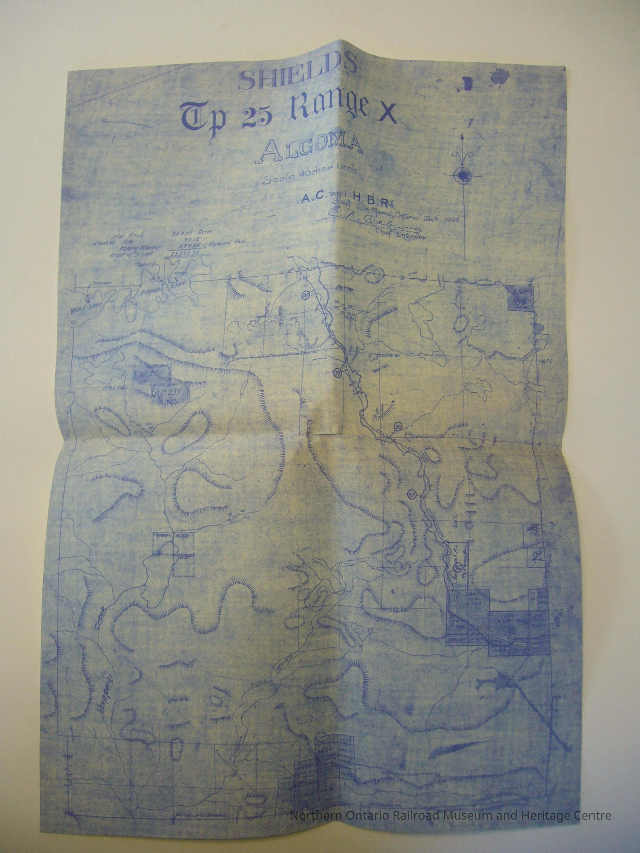 Copy of a map of township 25 range X, Algoma including Sheppards Creek, Tote Road, Wolf Lake and Prugh Lake. Map by Algoma Central and Hudson Bay Railway Company.