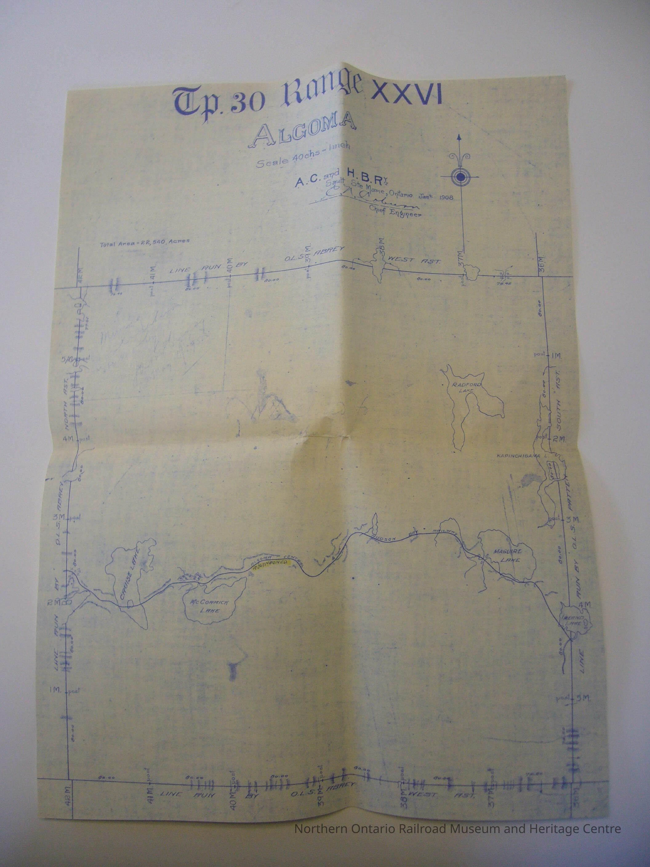 Copy of a map of township 30 range XXVI, Algoma including Cruise Lake, McCormick Lake, Maguire Lake and Radford Lake. Map by Algoma Central and Hudson Bay Railway Company.