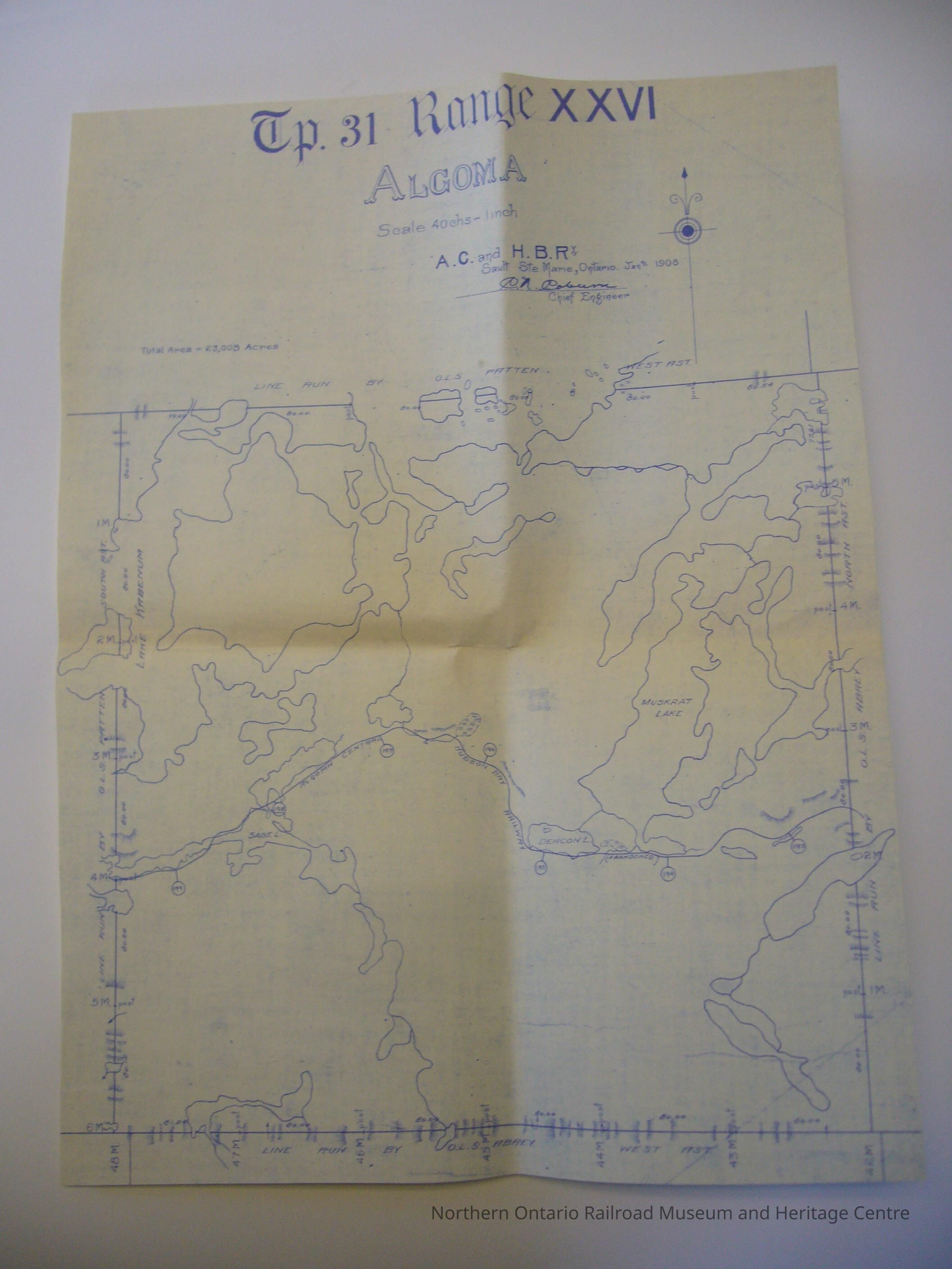 Copy of a map of township 31 range XXVI, Algoma including Muskrat Lake, Lake Kabenum, Sage Lake, and Deacon Lake. Map by Algoma Central and Hudson Bay Railway Company.