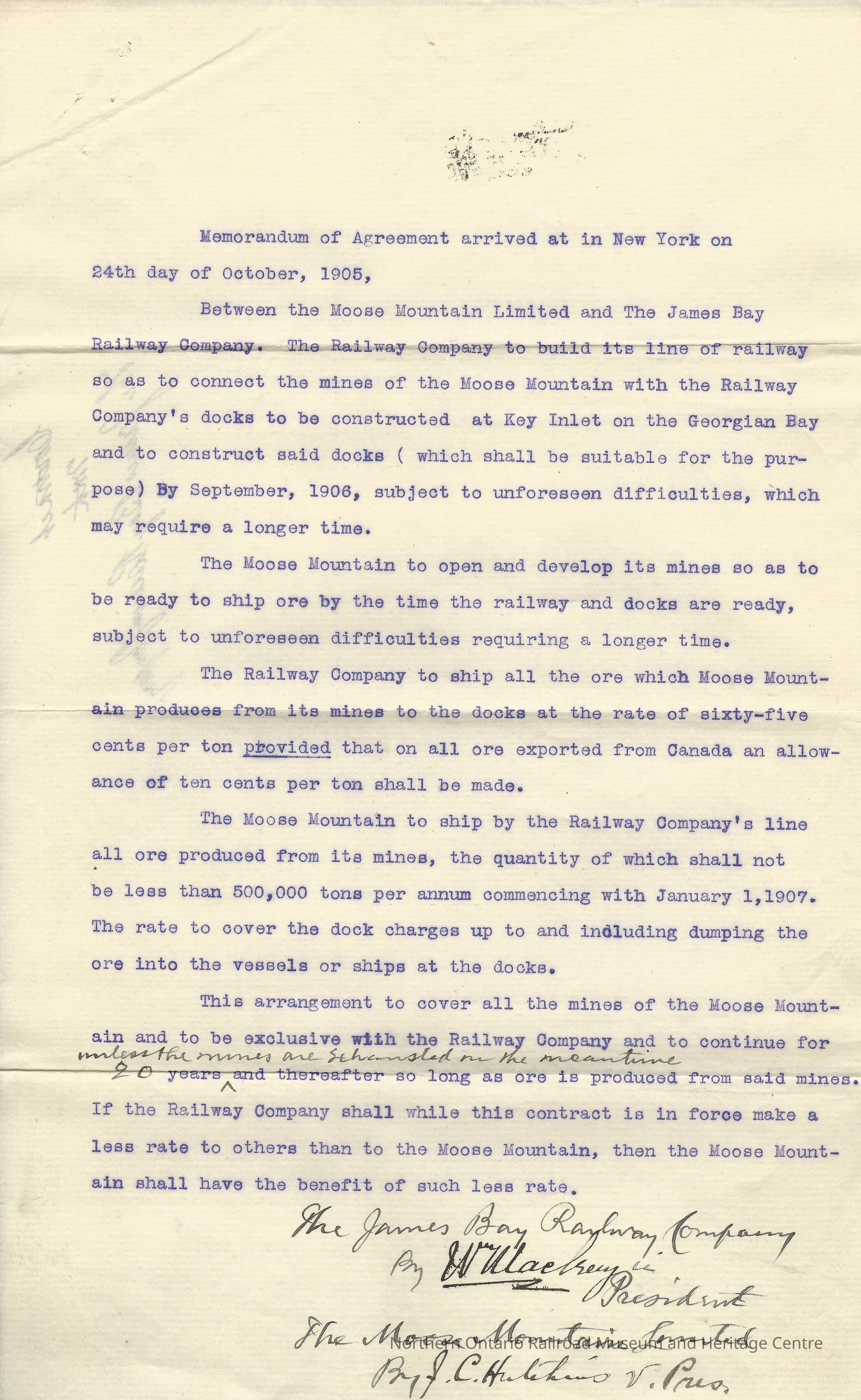 Memorandum of Agreement between Moose Mountain, Limited and James Bay Railway Company. Arrived in New York on 24th October 1905.Entry/Object ID