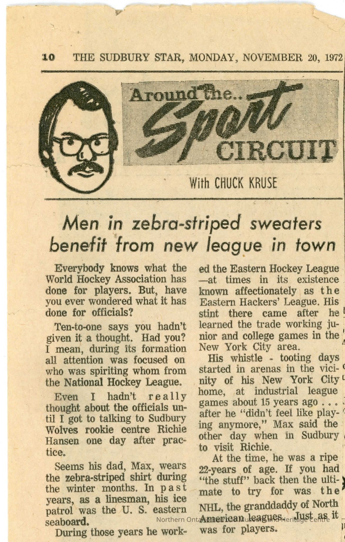"Men in zebra-striped sweaters benefit from new league in town" in Sudbury Star, November 20, 1972Description