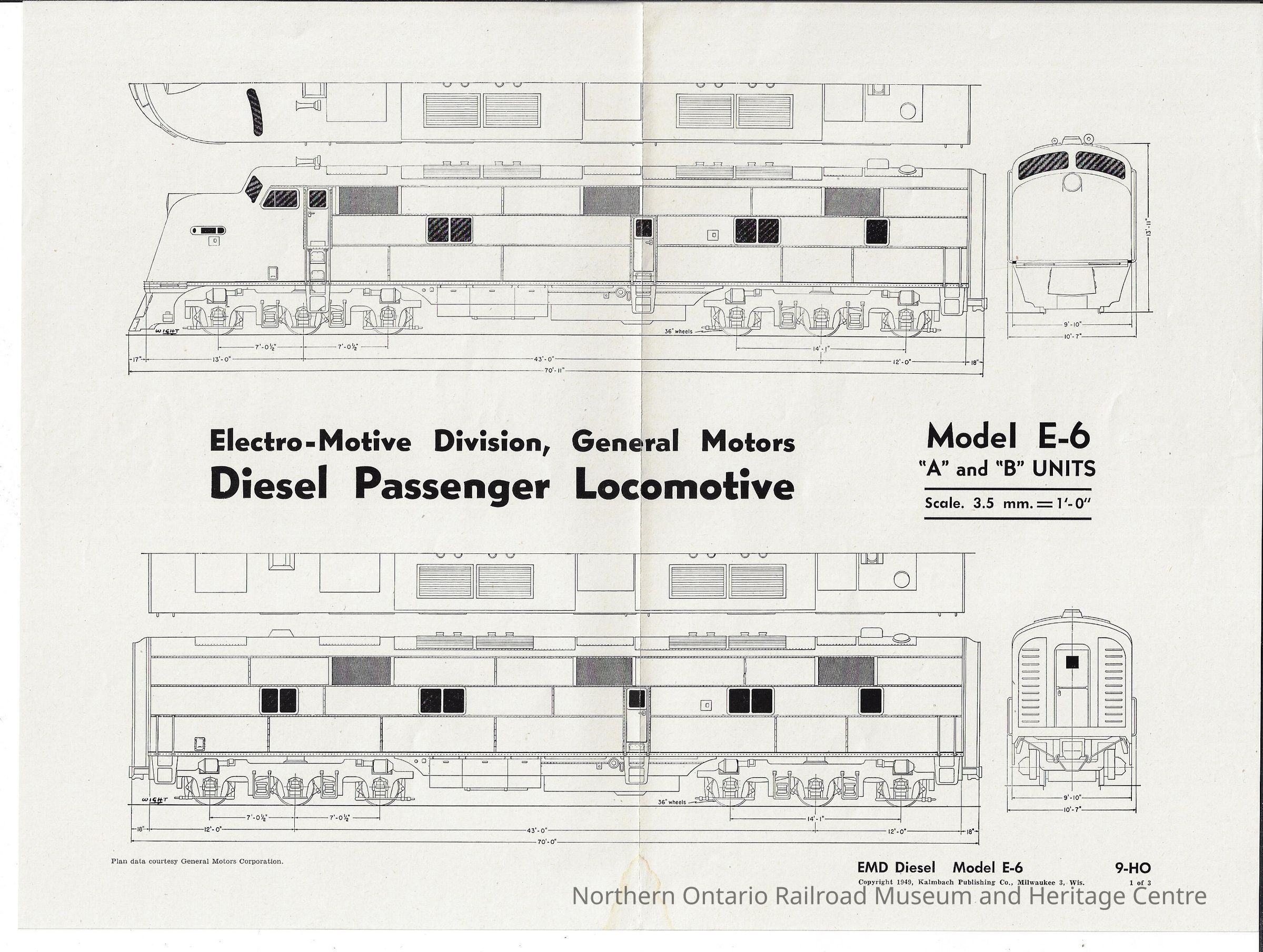 Model scale blueprints for a General Motors electro-motive diesel passenger locomotive, Model E-6 "A" and "B" Units. It provides scale measurements for each side of the locomotive as well as which items belong where so that the modeler can make a scale model. It also provides a brief history on the model itself.