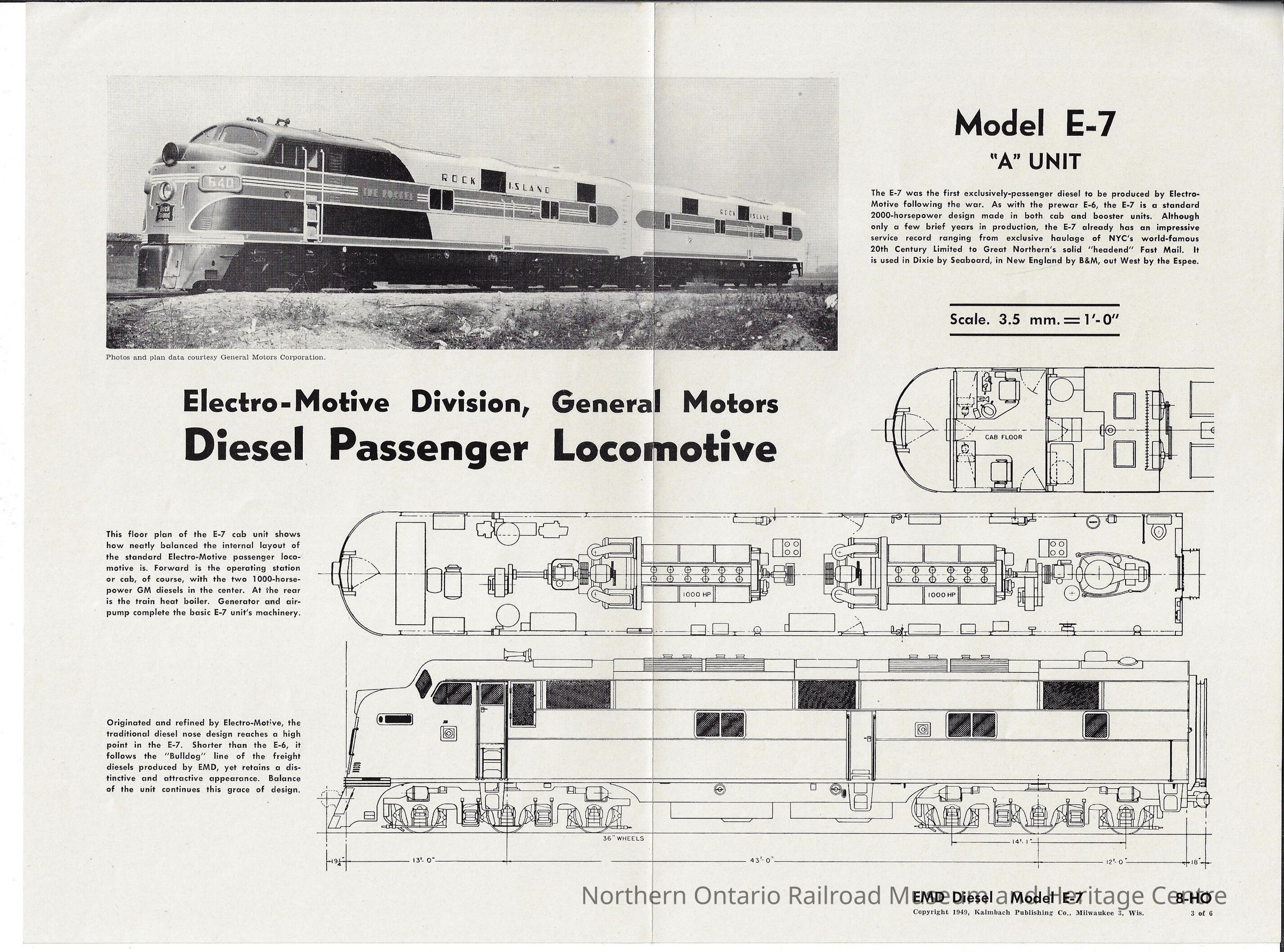 Model scale blueprints for a General Motors electro-motive diesel passenger locomotive, model E-7 "A" Unit. It provides scale measurements for each side of the locomotive as well as which items belong where so that the modeler can make a scale model. It also provides a brief history on the model itself.