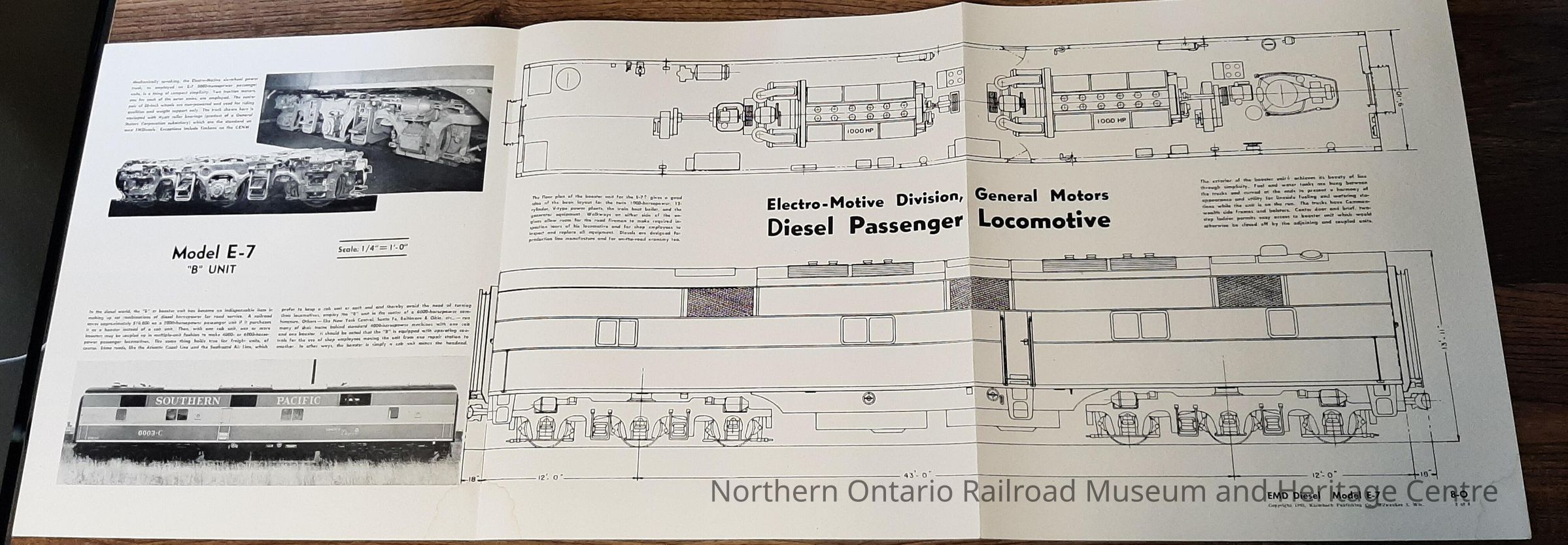 Model scale blueprints for a General Motors electro-motive diesel passenger locomotive, model E-7 "B" Unit. It provides scale measurements for each side of the locomotive as well as which items belong where so that the modeler can make a scale model. It also provides a brief history on the model itself.