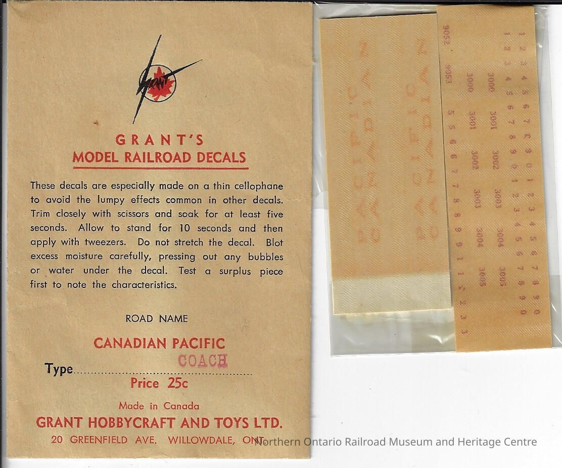 Envelope from Grant's Model Railroad Decals. The envelope contains Canadian Pacific Coach decals for model train cars and locomotives. The decals are incapsulated in plastic have both numbers and letters. The envelope also includes instructions on how to apply the decals
