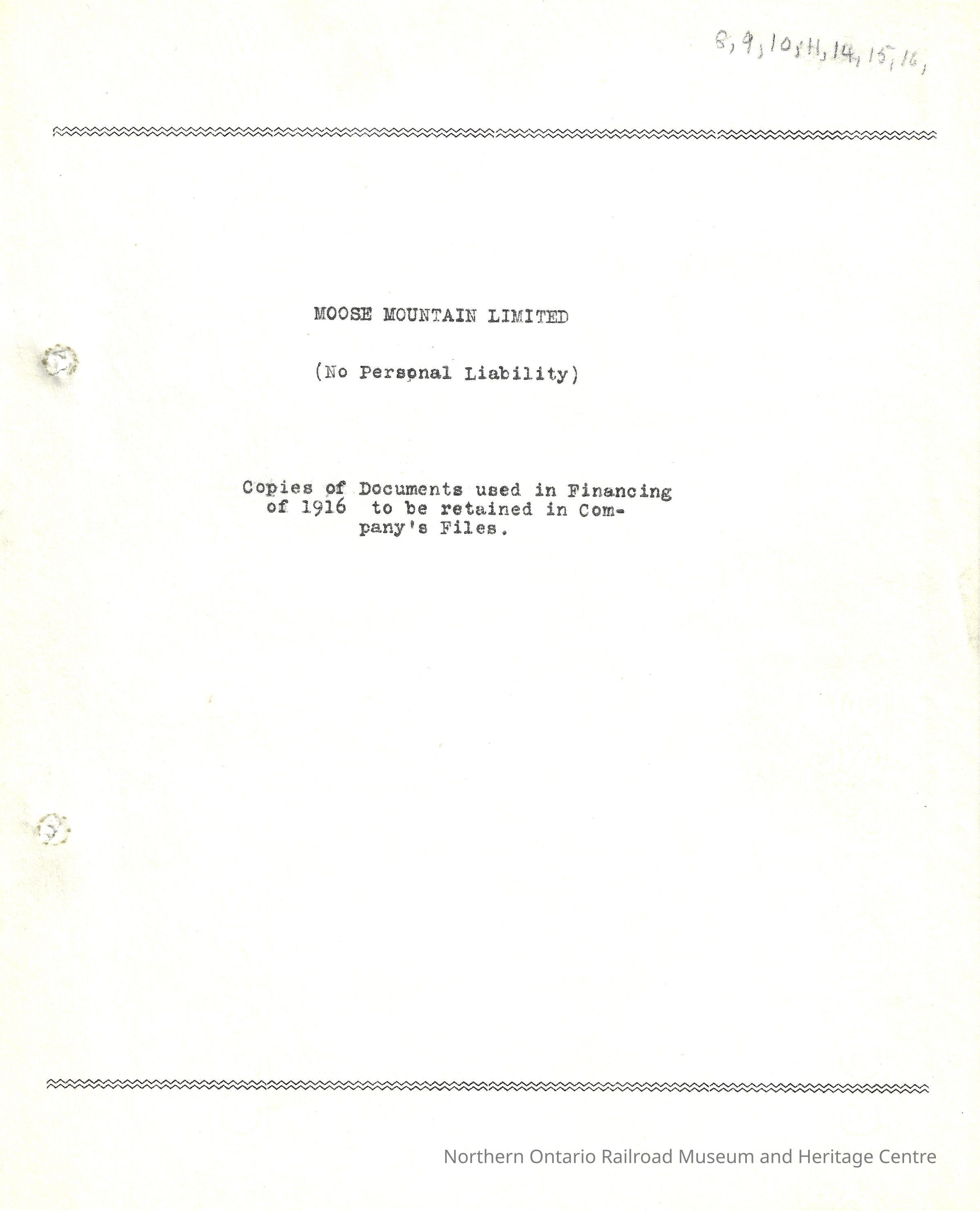 Moose Mountain Limited (No Personal Liability), Copies of Documents used in Financing of 1916 to be retained in Company's FilesEntry/Object ID