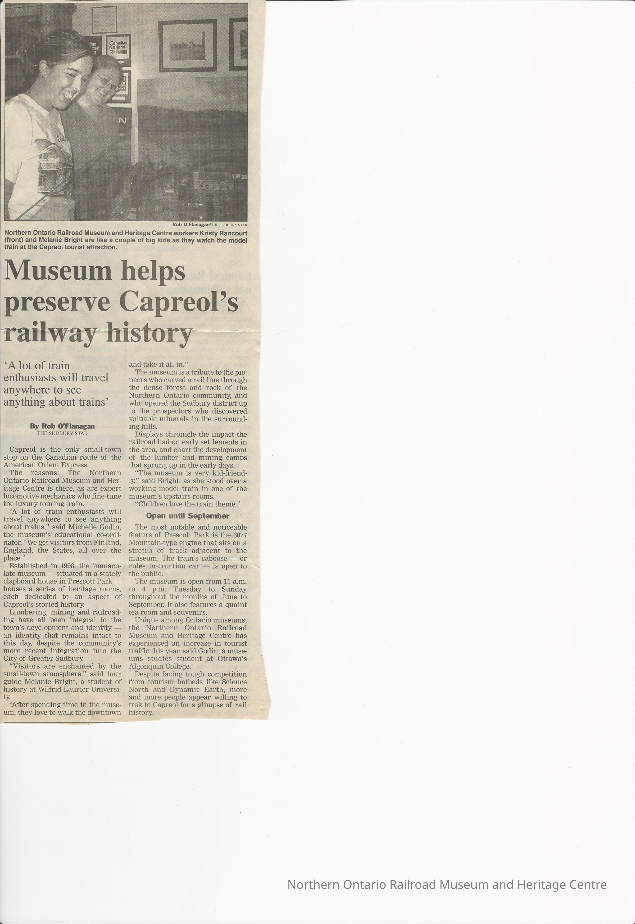 "Museum helps preserve Capreol's railway history" in The Sudbury Star, August 26, 2004. Features Kristy Raincourt and Melanie Bright as staff in the museum, explanation of museum offerings.Collection