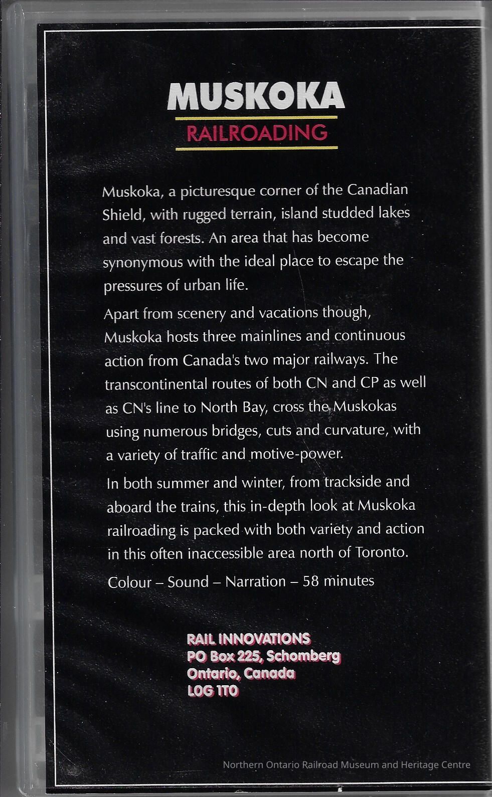 A VHS tape documentary, "an in-depth look at Muskoka railroading". Colour - Sound - Narration - 58 minutes.Context