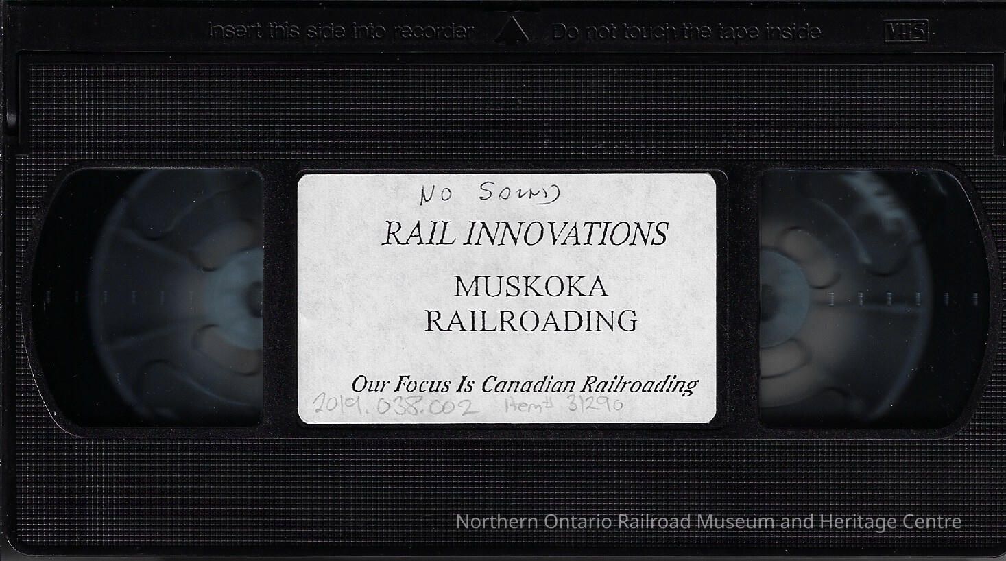 Stored in a clear plastic VHS tape, with a black paper cover inserted. On the front is printed "Muskoka Railroading" at the top in white and pink text. Below are three images of trains, and at the very bottom "Rail Innovations" is printed in white text. The VHS tape is black with a white lable affixed on the front center. Printed on this are the words "Rail Innovations Muskoka Railroading Our Focus Is Canadian Railroading".Collection