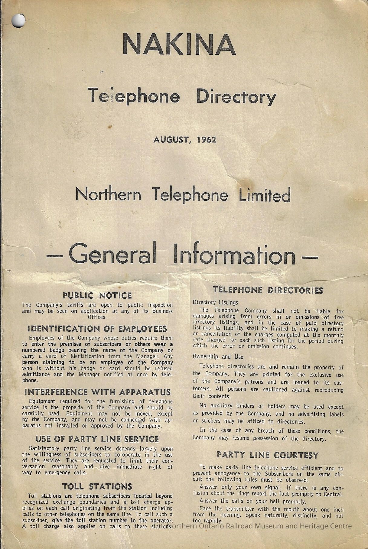 Nakina Telephone Directory, August 1962Description