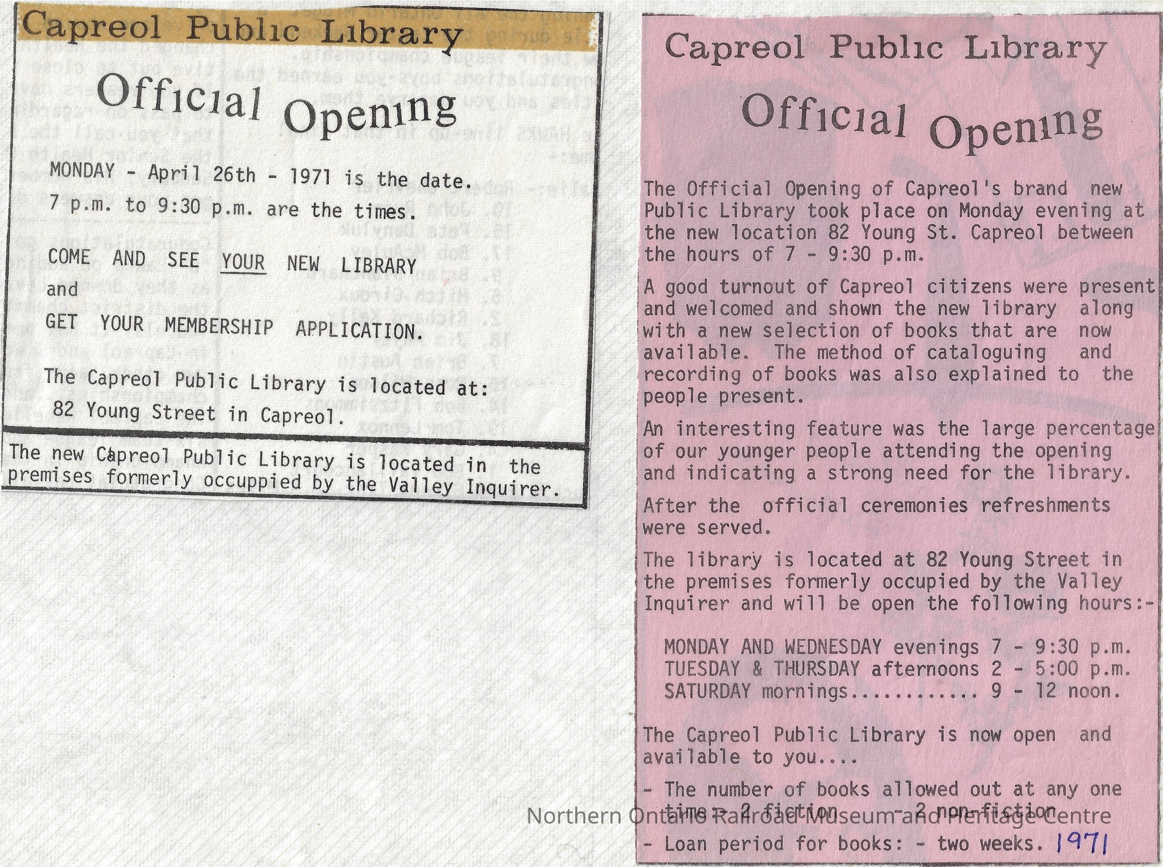 Two news clippings, one giving notice of the official opening of the new Capreol Public Library at 82 Young Street in Capreol on Monday April 26th, and the other describing the event and listing opening hours.Collection