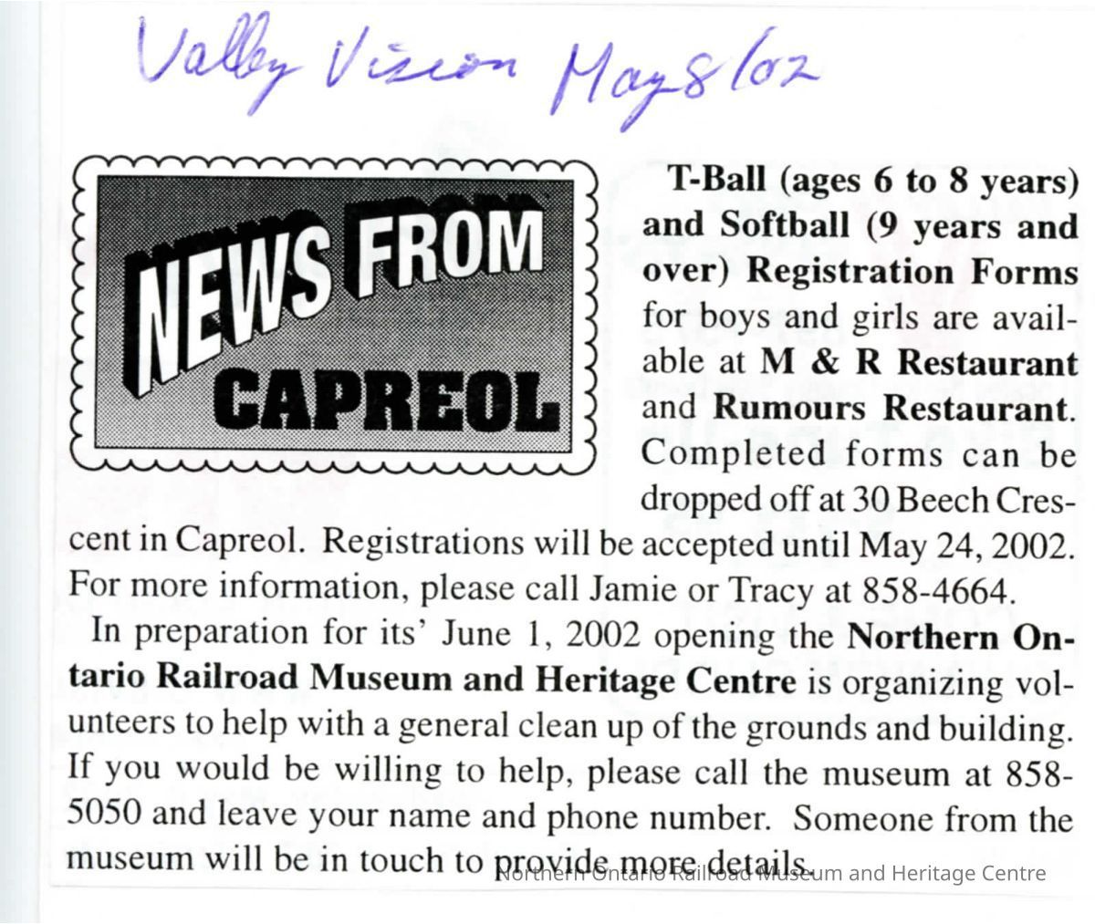 "News from Capreol" in The Valley Vision, 8 May 2002. Calls for organization of volunteers for general cleanupCollection