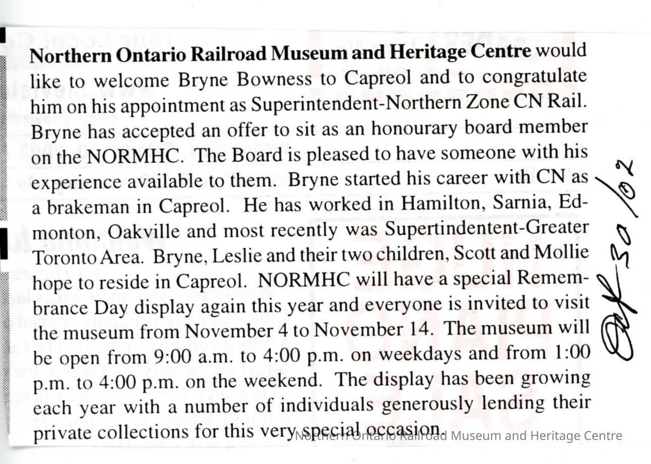 "News from Capreol" in Valley Vision, 30 October 2002. Welcomes Byrne Bowness to Capreol and congratulate on new position as CN Superintendent Northern Zone.Collection