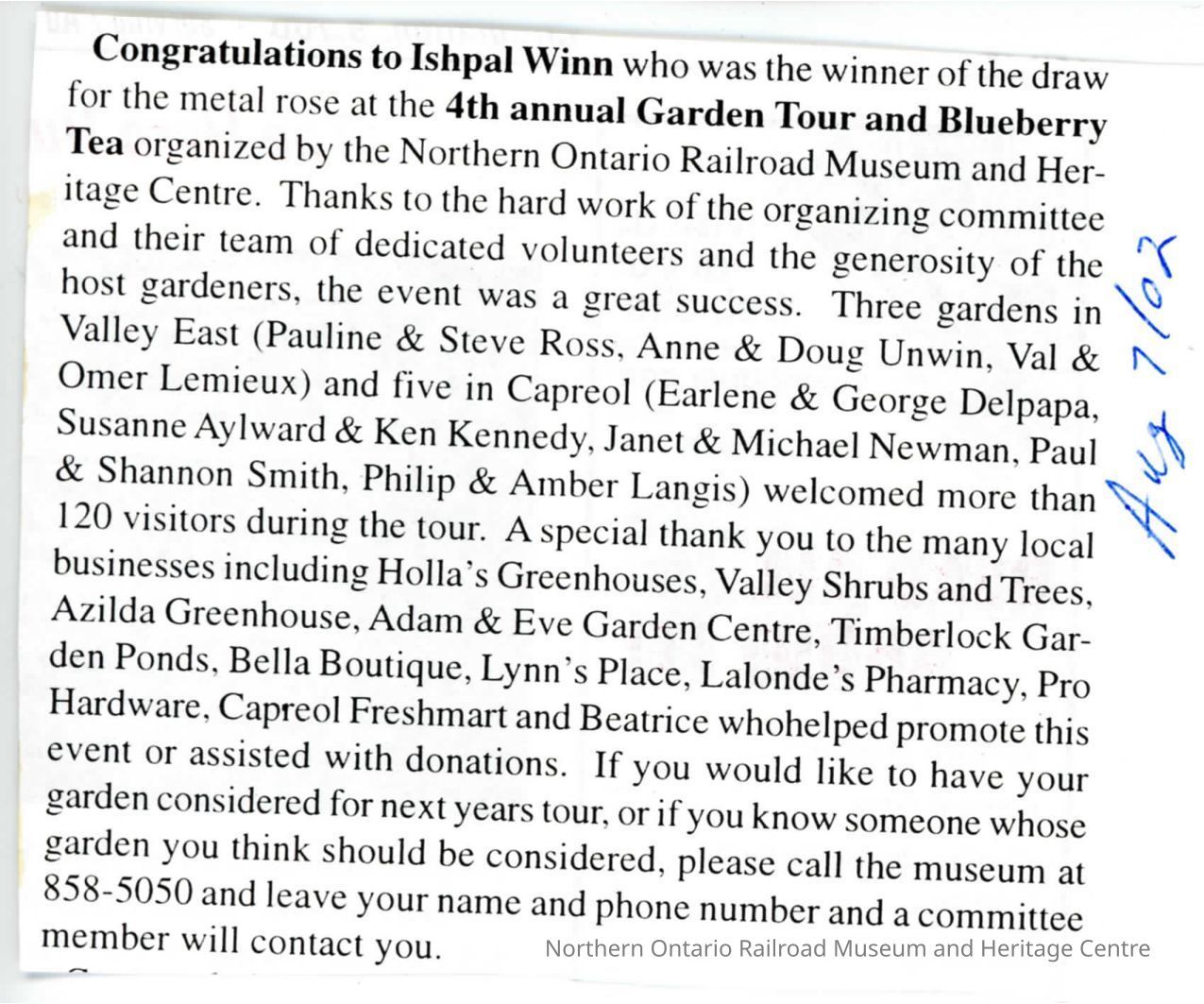 "News from Capreol" in Valley Vision, 7 August 2016. Outlines garden tour as well as winner of metal rose.Collection