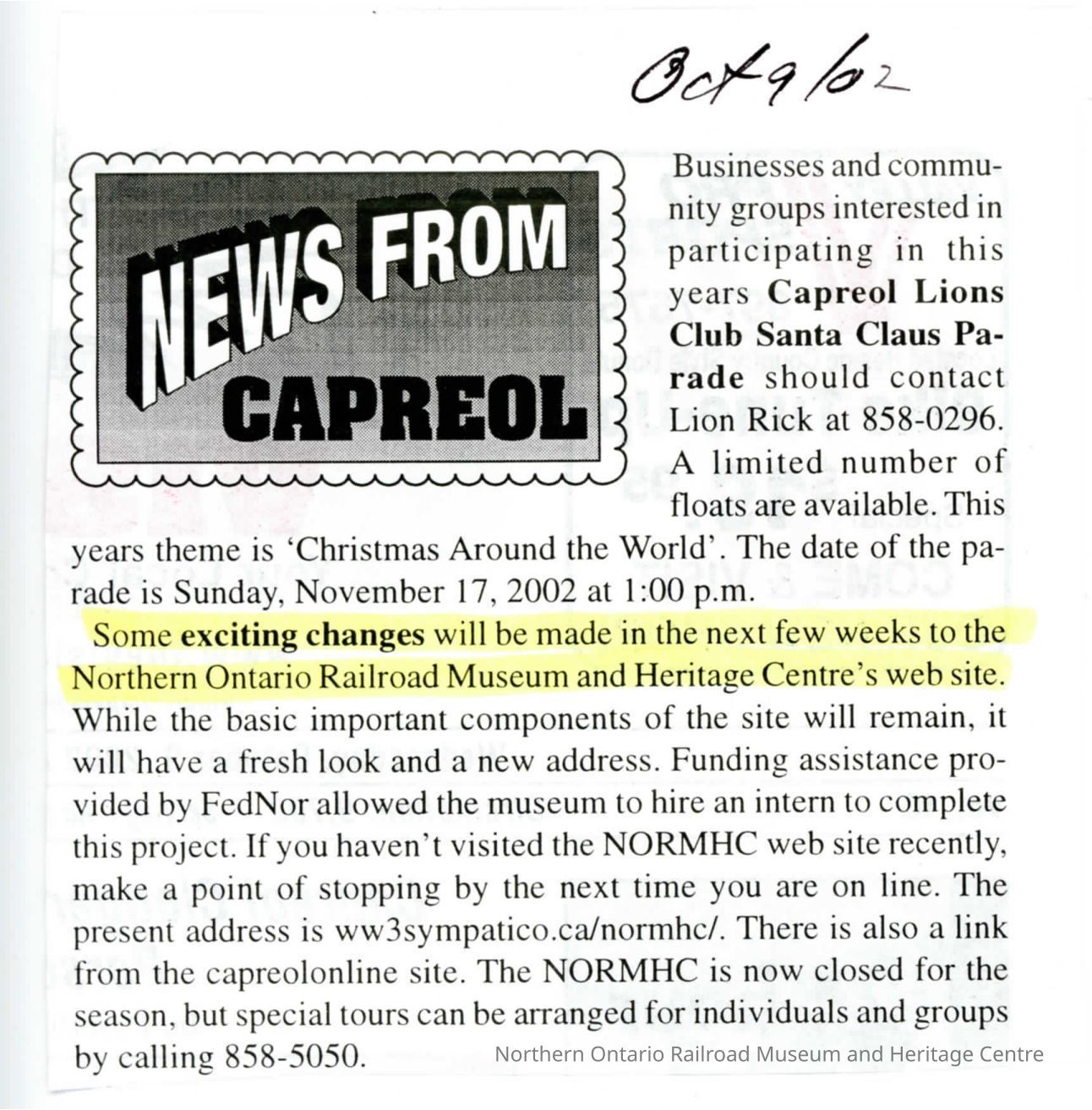 "News from Capreol" in Valley Vision, 9 October 2002. Outlines changes made to NORMHC website.Collection