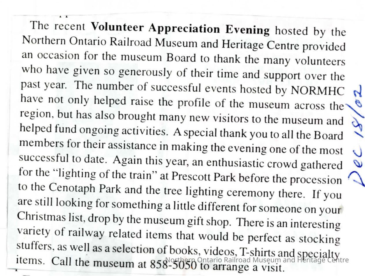 "News from Capreol" in Valley Vision, December 18, 2002. Recap of the events of the NORMHC 2002 Volunteer Appreciation Dinner.Collection
