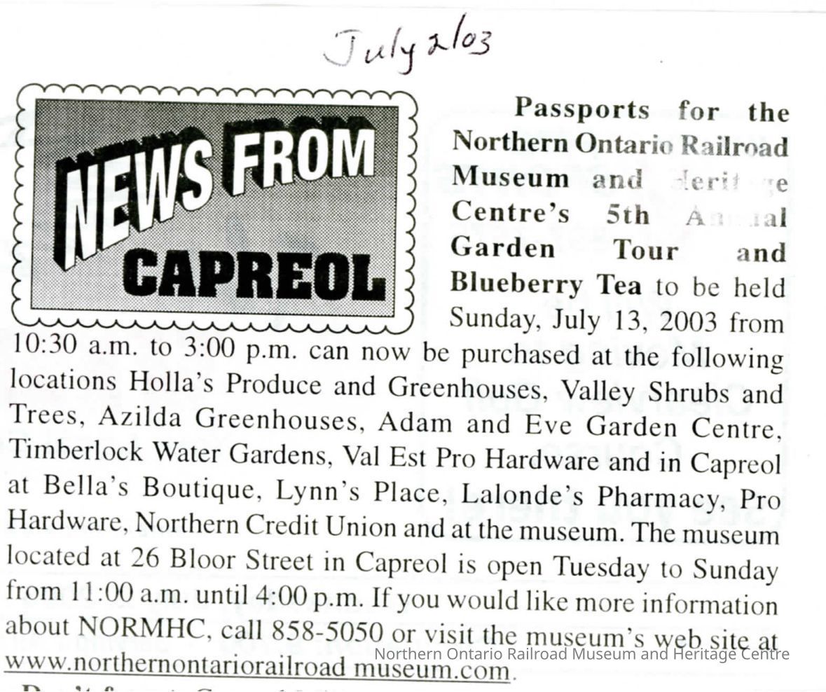 "News from Capreol" in Valley Vision, July 3, 2002. Outline of the offerings for the 5th Annual Blueberry tea and Garden Tour.Collection
