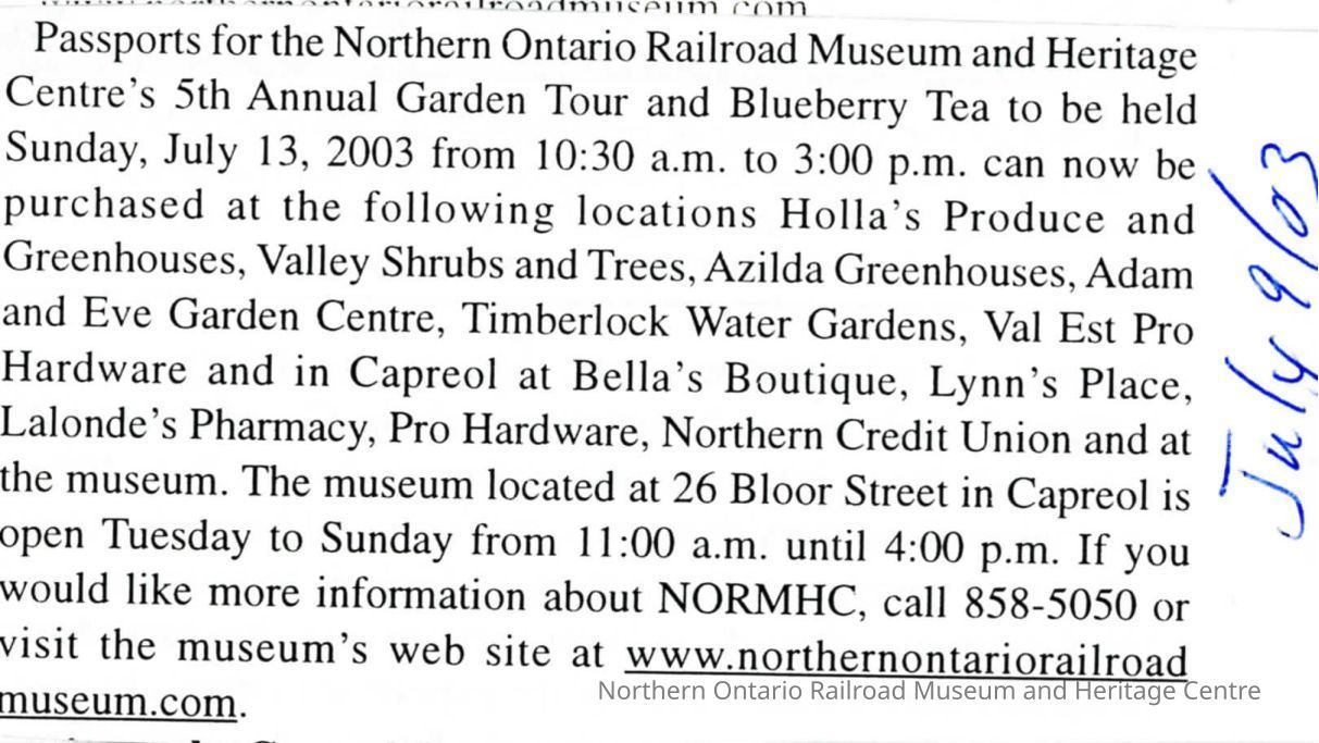 "News from Capreol" in Valley Vision, July 9, 2003. Offering Passports for the 5th Annual Blueberry tea and Garden Tour.Collection