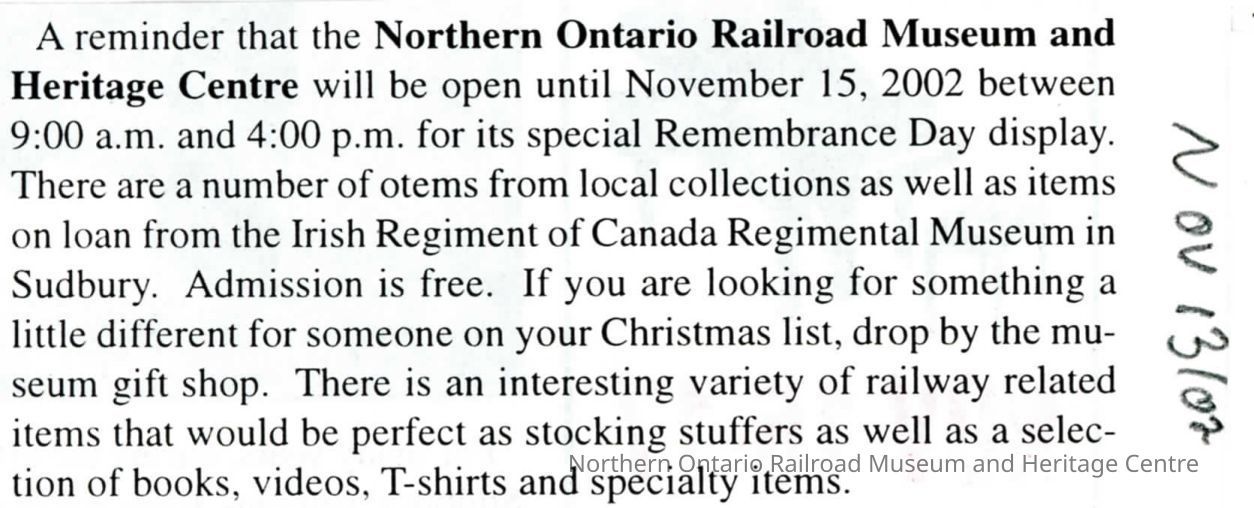 "News from Capreol" in Valley Vision, November 13, 2002. Reminder for the 2002 Remembrance day ceremony.Collection
