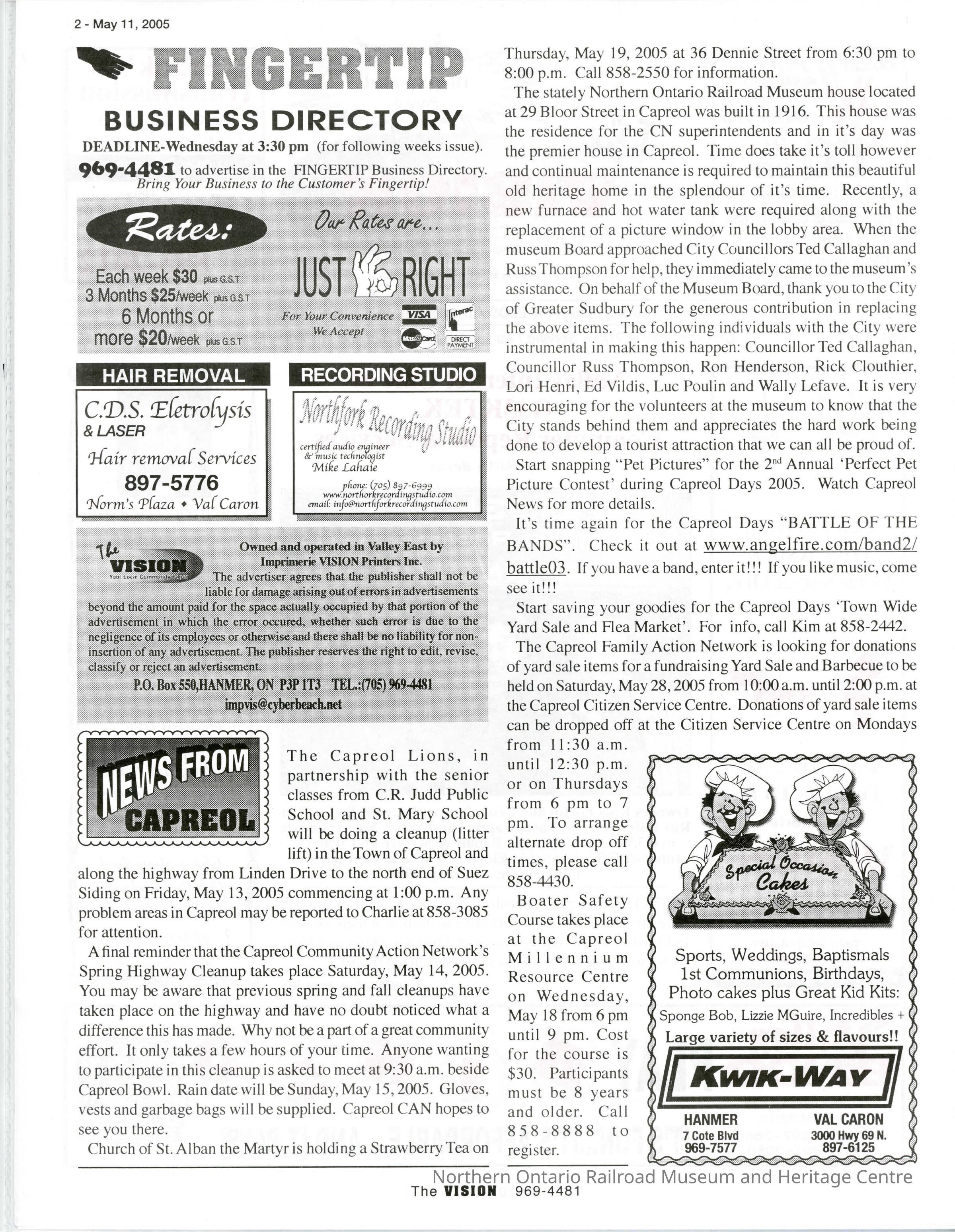 "News From Capreol: NORMHC Water Tank and Furnace" in The Vision, May 11, 2005, featuring a thnak you from NORMHC to the community and volunteers for helping with a new furnace and Water TankCollection