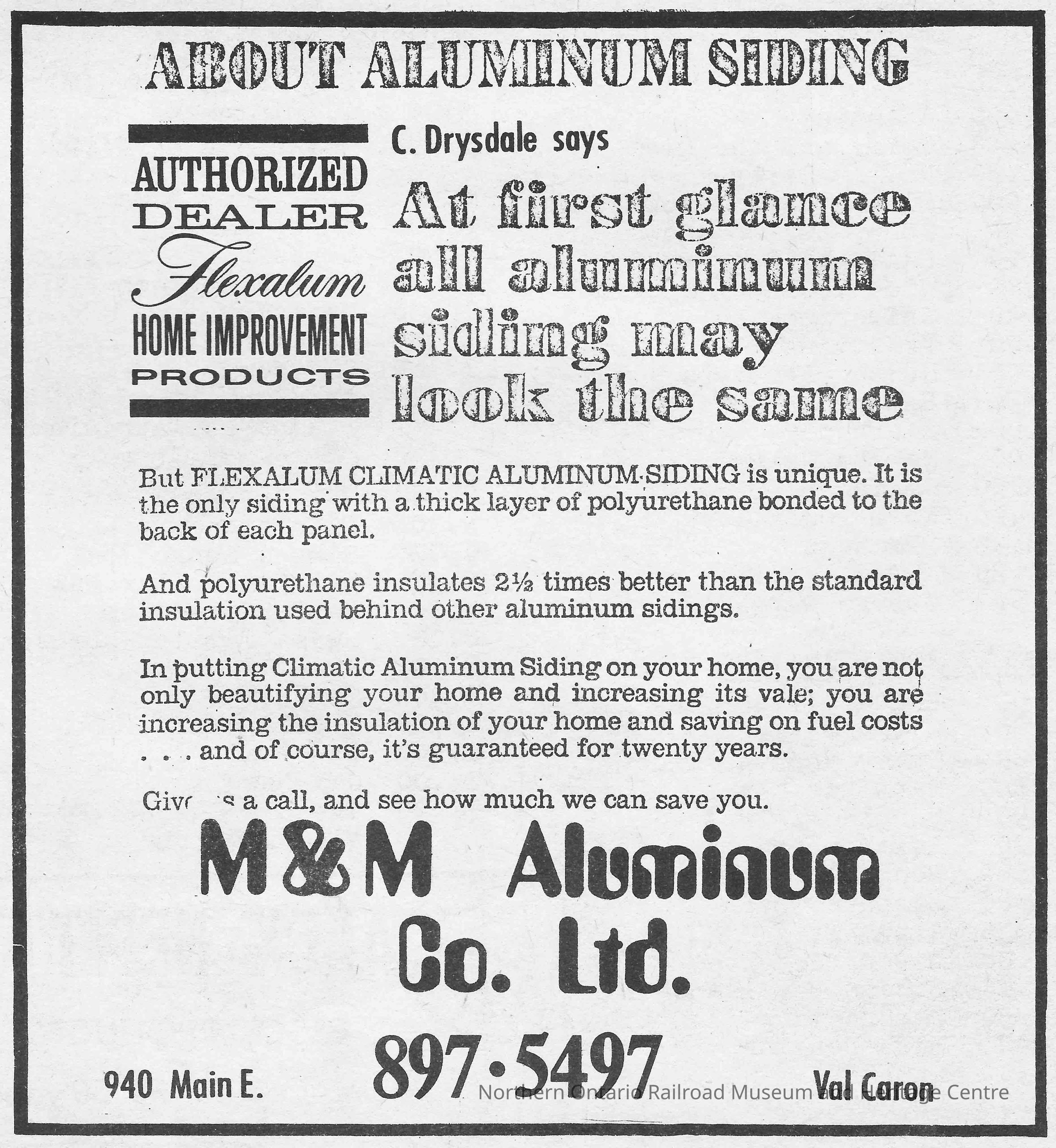Newspaper Advertisement, M&M Aluminum Company Limited, Val Caron.Collection