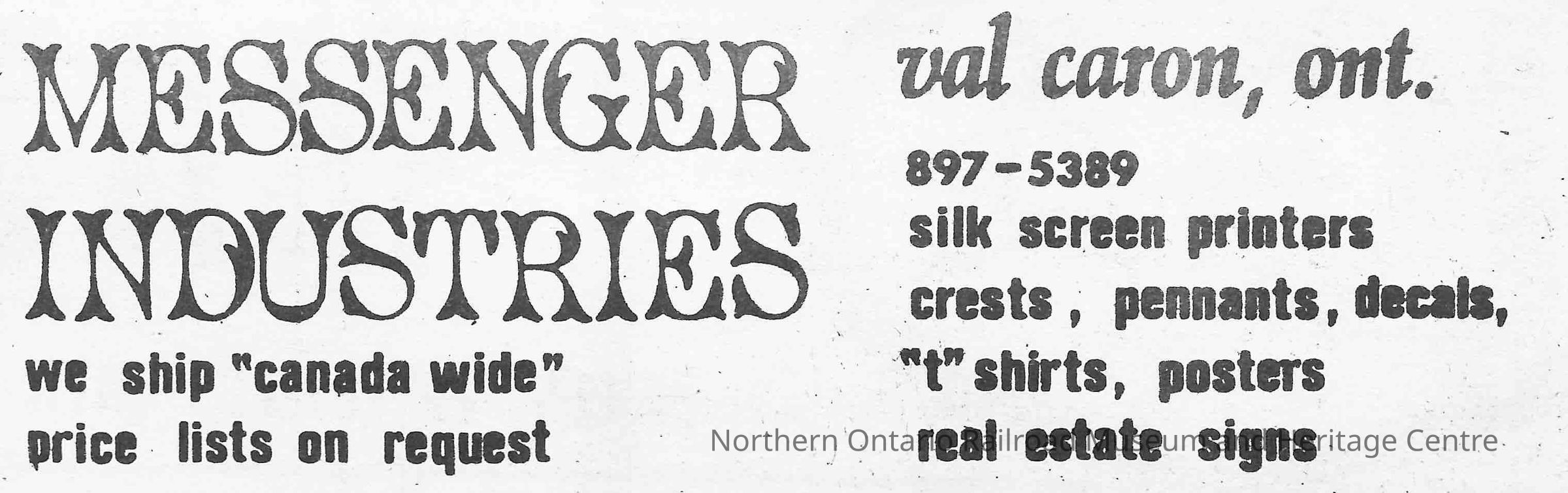 Newspaper Advertisement, Messenger Industries, Val Caron.Collection