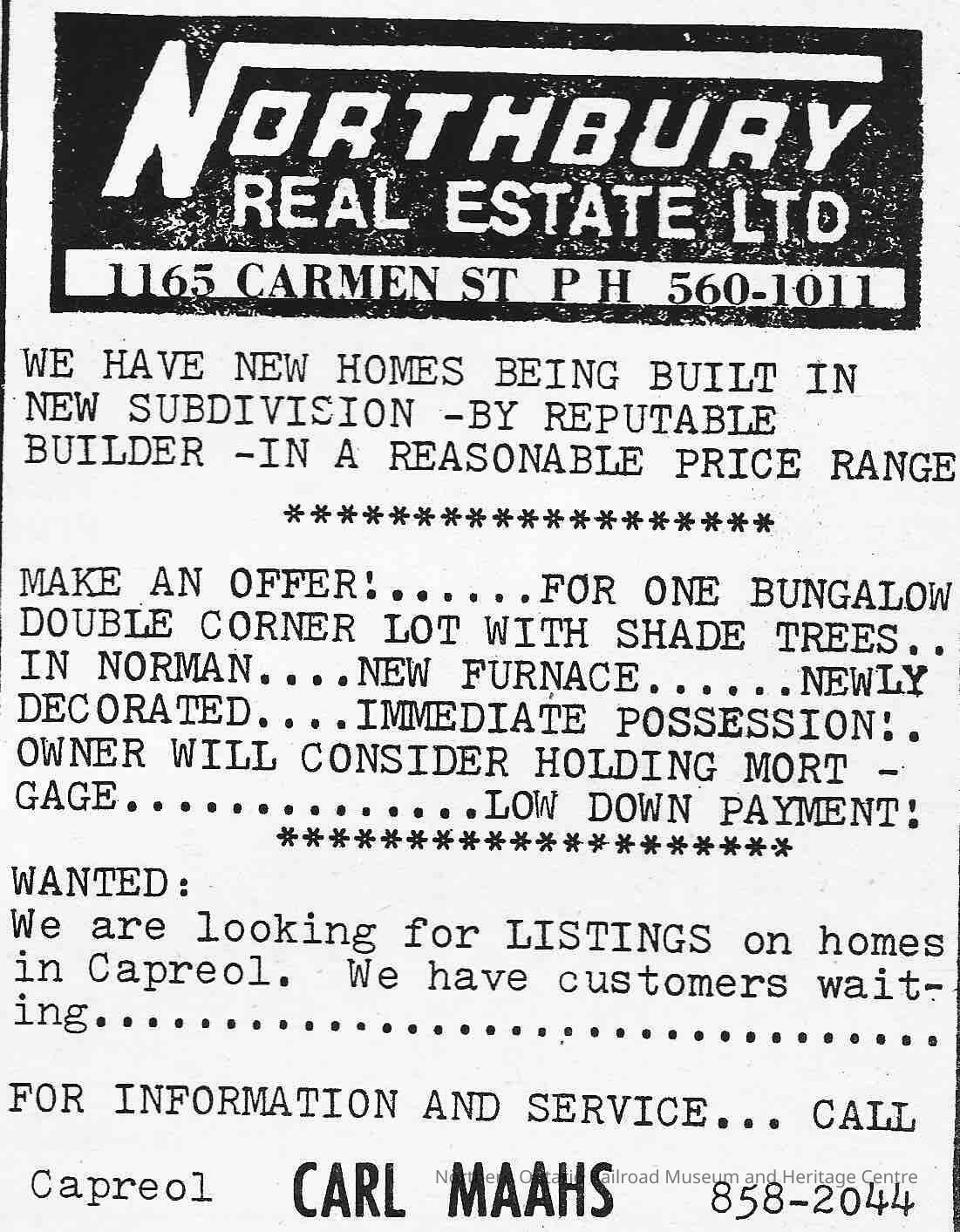 Newspaper Advertisement, Northbury Real Estate.Collection