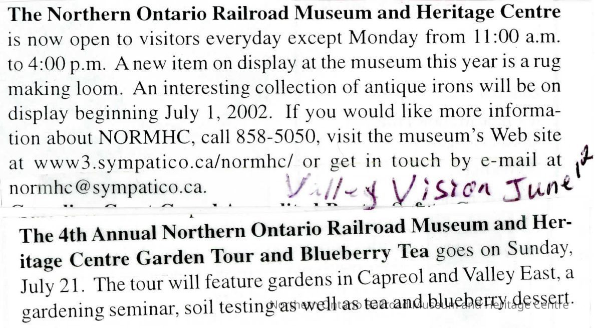 "NOMRHC Garden Tour and Blueberry Tea" in Valley Vision, 12 June 2002Description